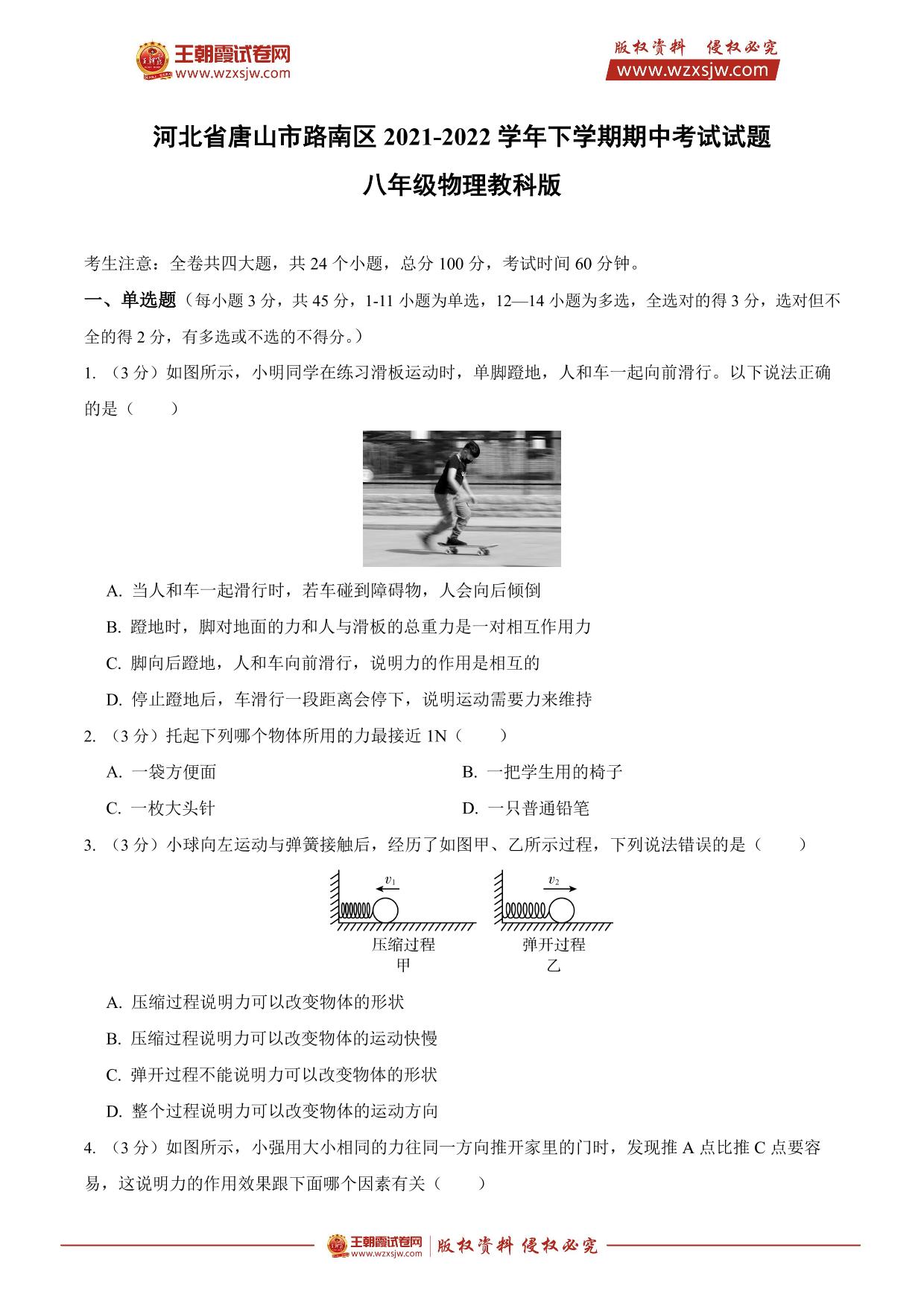 河北省唐山市路南区2021-2022学年下学期期中考试试题八年级物理(教科版)