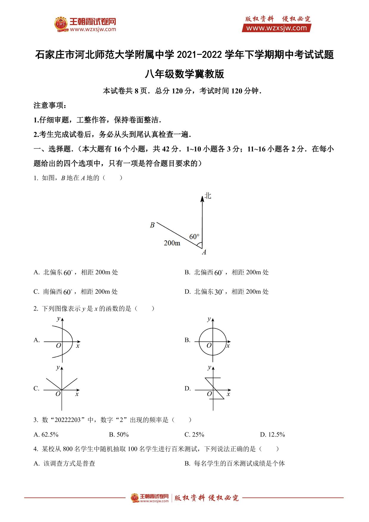 河北省石家庄市河北师范大学附属中学2021-2022学年下学期期中考试试题八年级数学(冀教版)