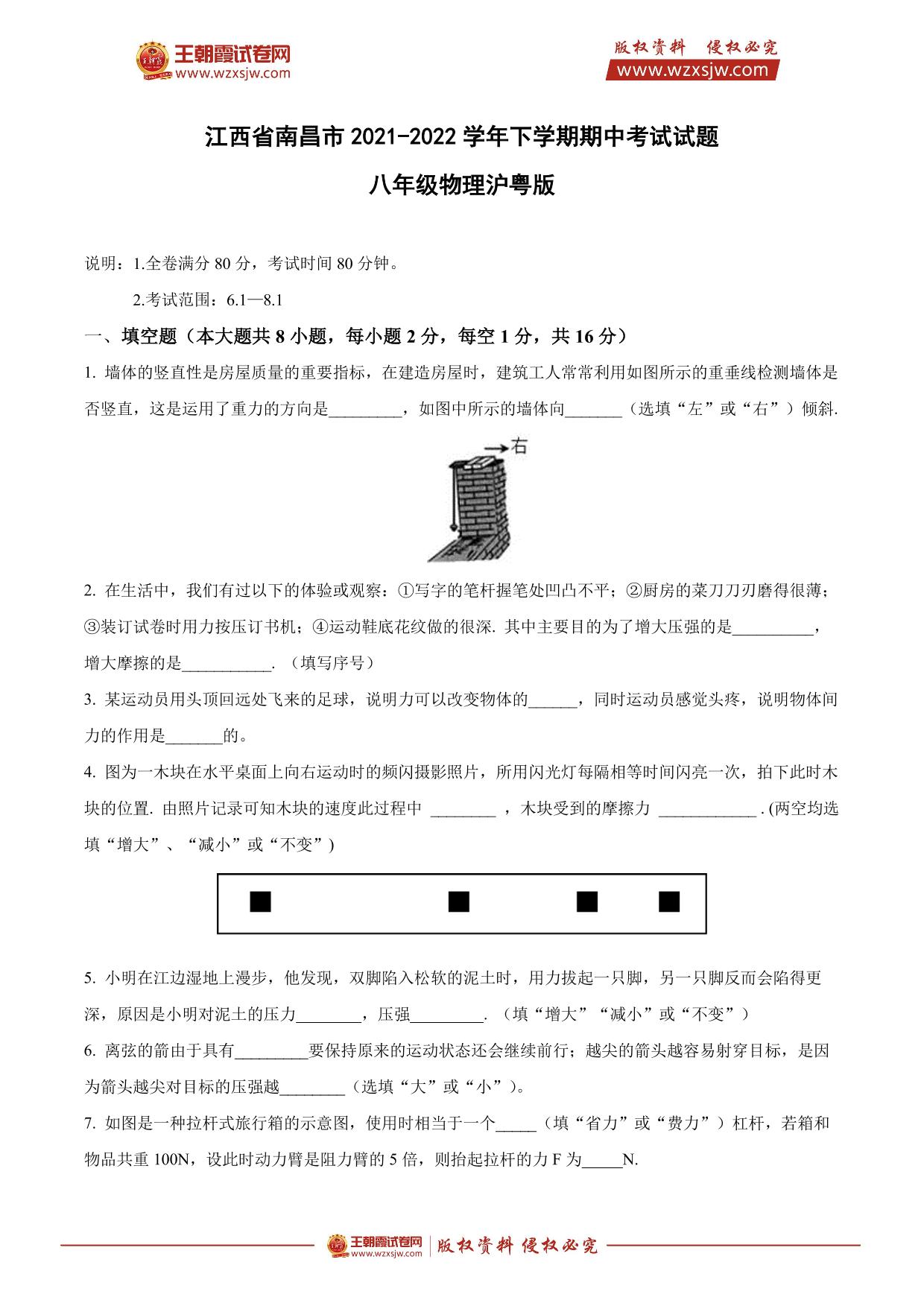 江西省南昌市2021-2022学年下学期期中考试试题八年级物理(沪粤版)