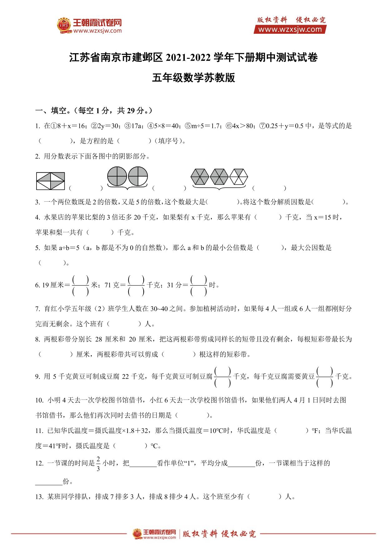江苏省南京市建邺区2021-2022学年下册期中测试试卷五年级数学(苏教版)