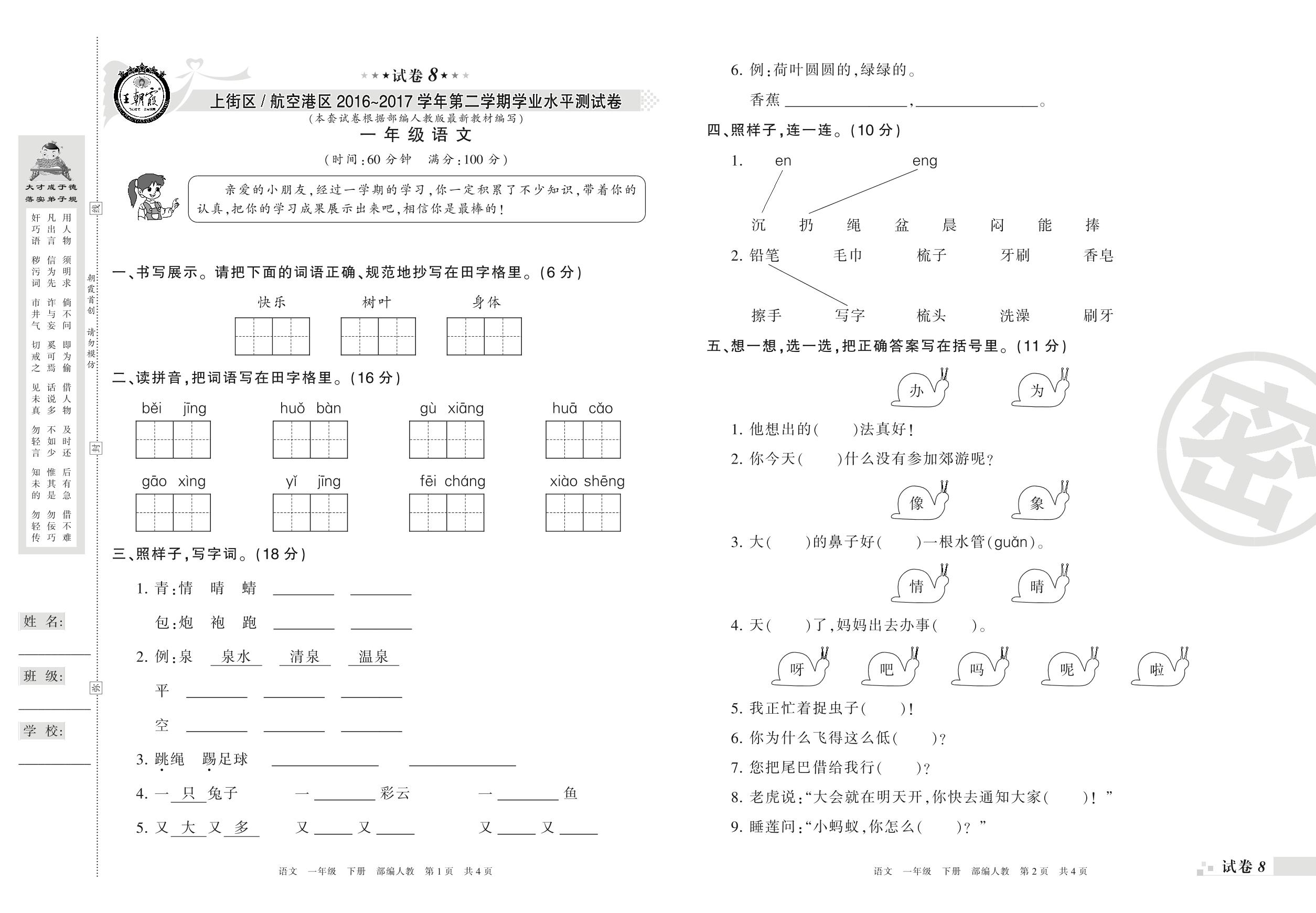 2016-2017学年第二学期郑州市上街区一年级语文试卷(人教版)【8】