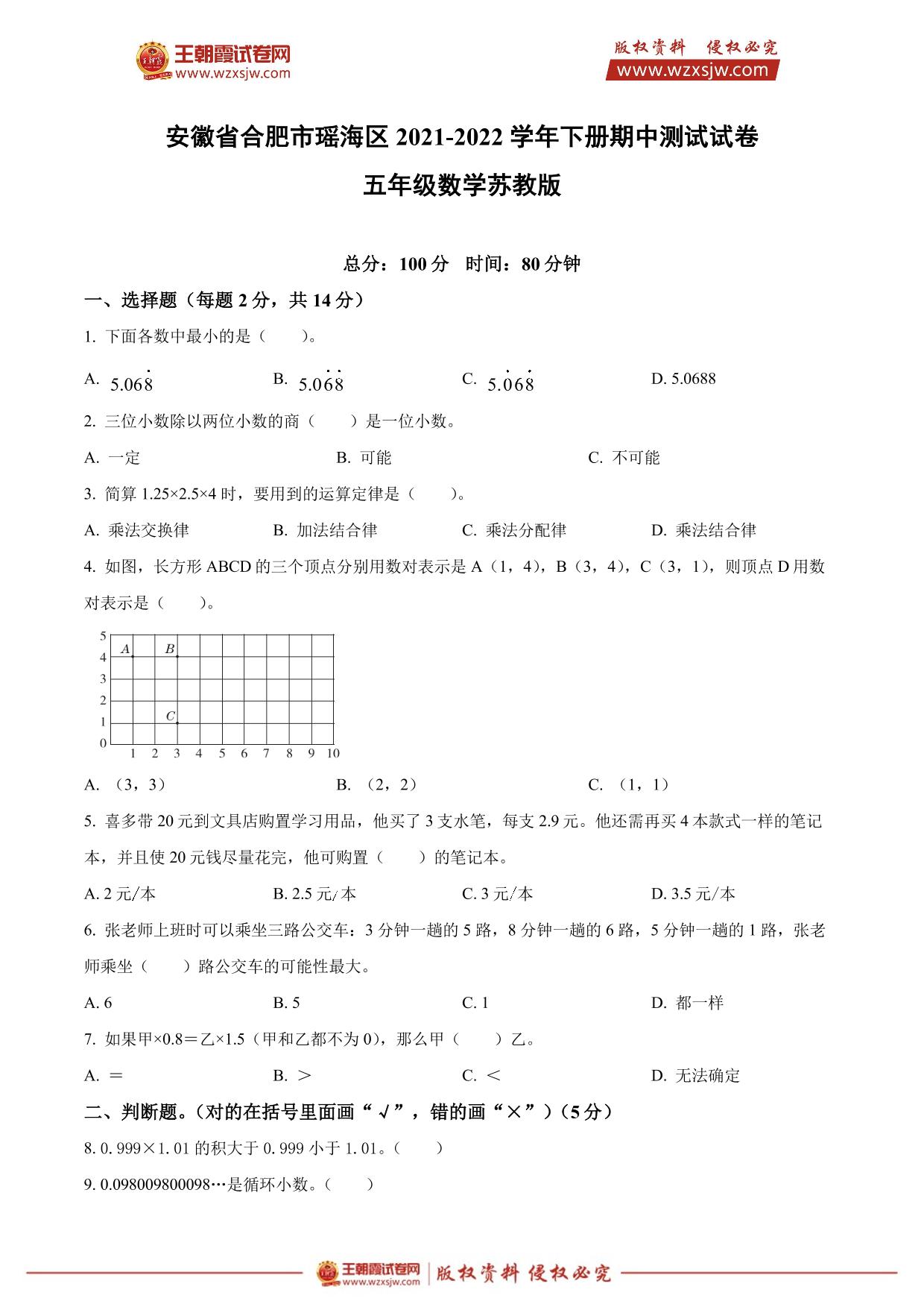 安徽省合肥市瑶海区2021-2022学年下册期中测试试卷五年级数学(苏教版)