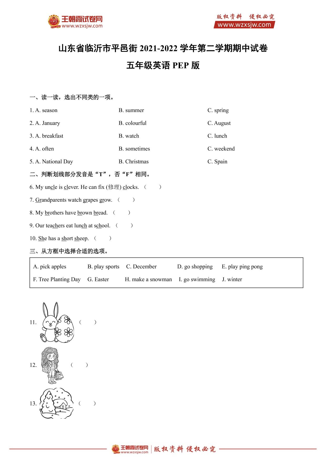 山东省临沂市平邑街2021-2022学年第二学期期中试卷五年级英语(PEP版)【无听力音频】