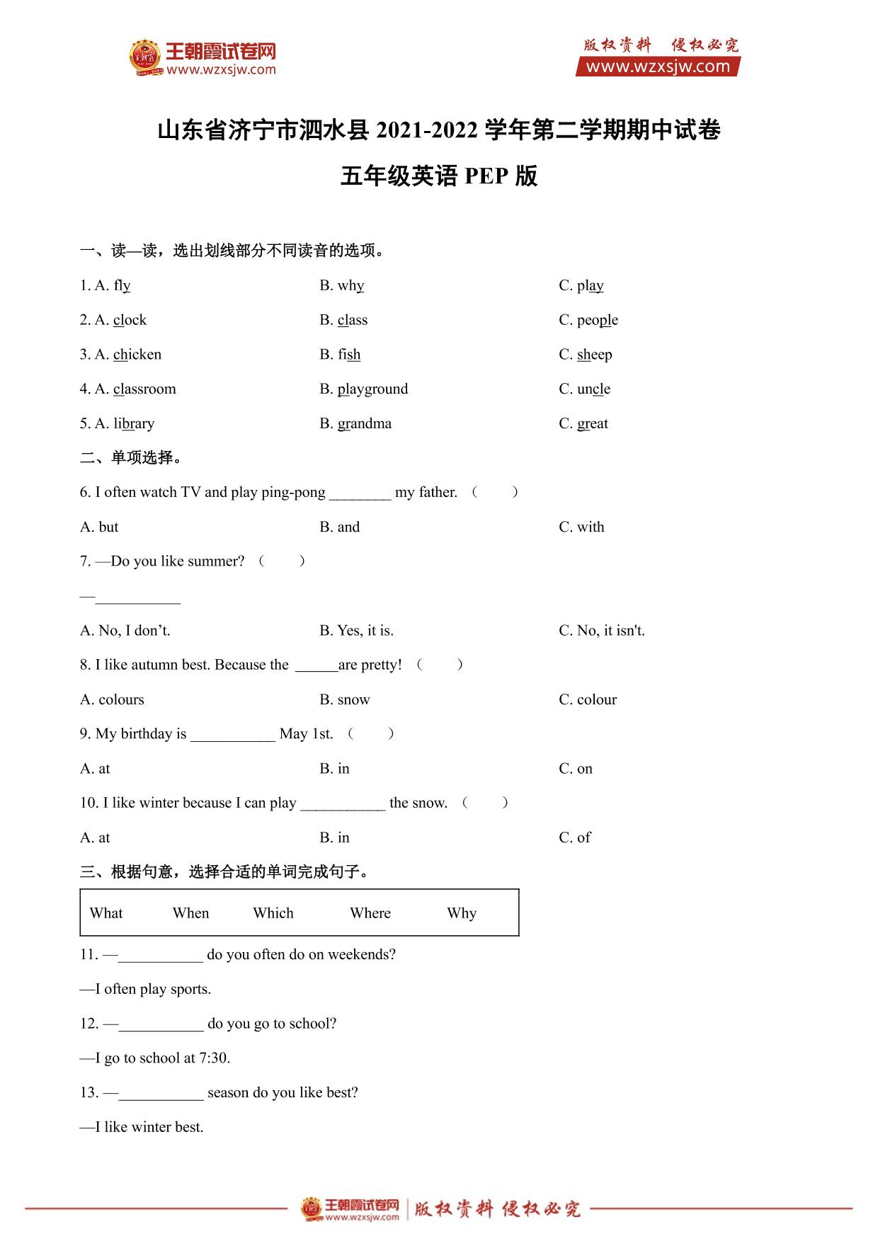 山东省济宁市泗水县2021-2022学年第二学期期中试卷五年级英语(PEP版)【无听力音频】