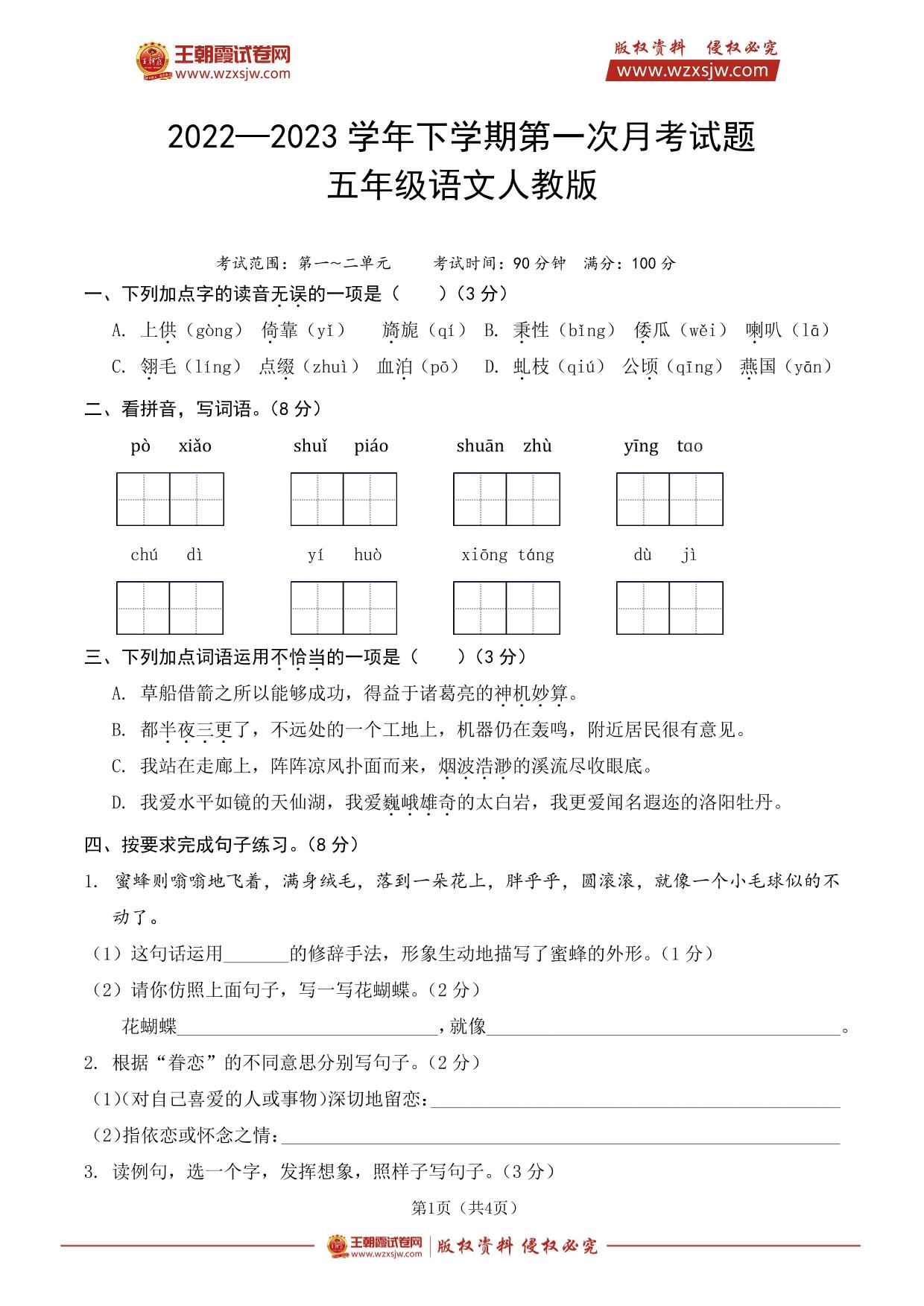 2022-2023学年下学期第一次月考试题五年级语文(人教版)