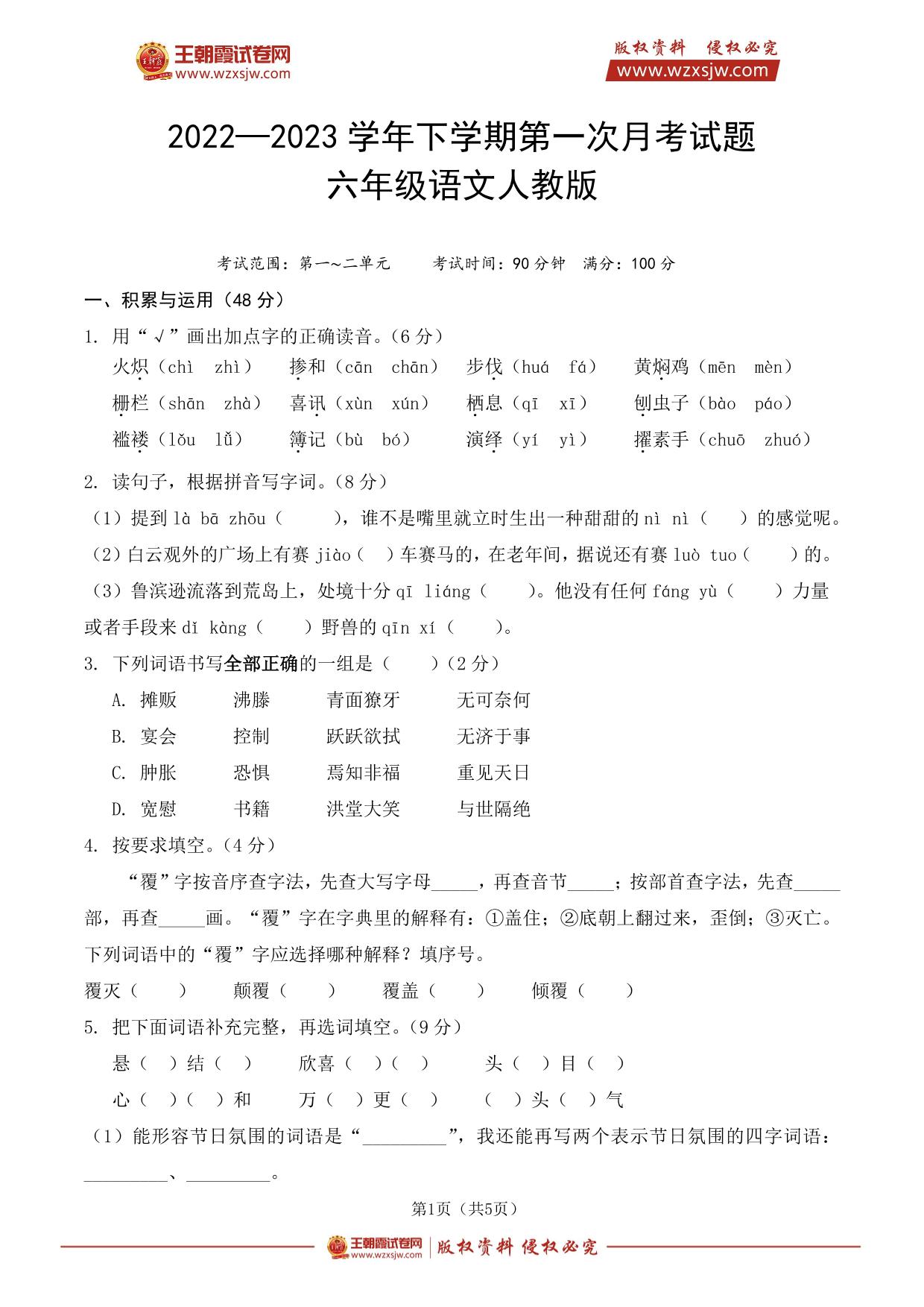 2022-2023学年下学期第一次月考试题六年级语文(人教版)