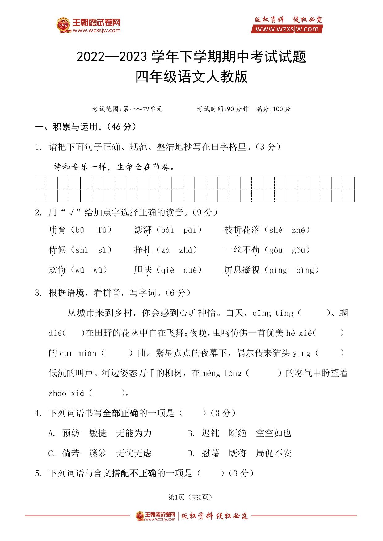 2022-2023学年下学期期中考试试题四年级语文(人教版)