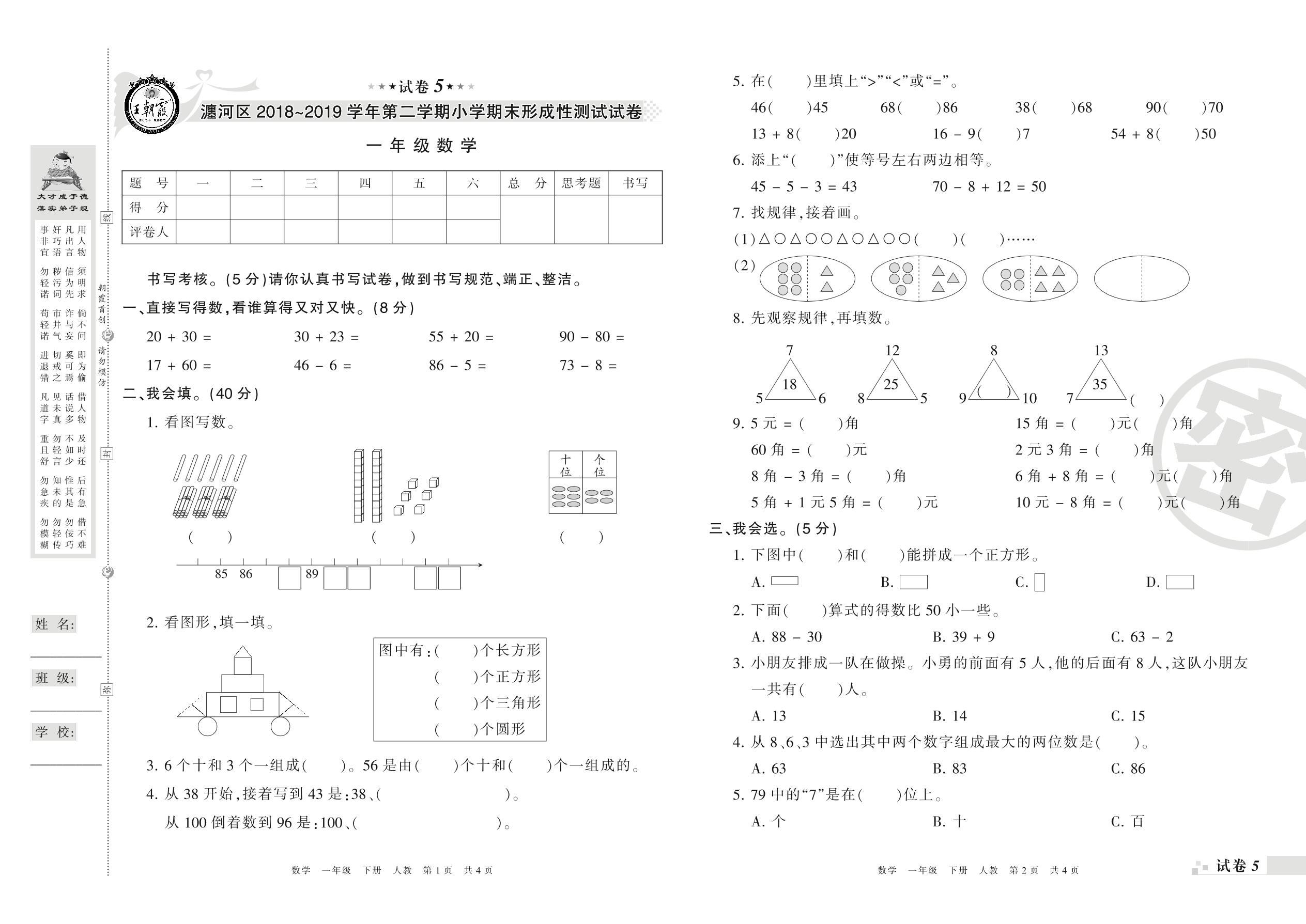 2018-2019学年第二学期洛阳市瀍河区一年级数学试卷(人教版)【5】