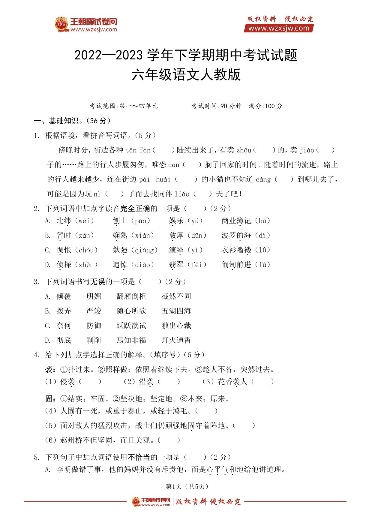 六年级语文人教版下册期中卷