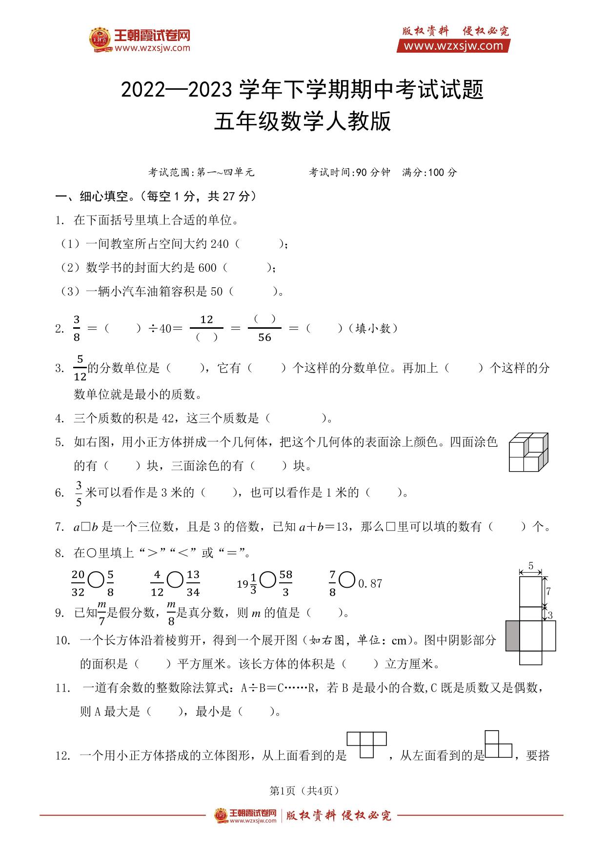 2022-2023学年下学期期中考试试题五年级数学(人教版)