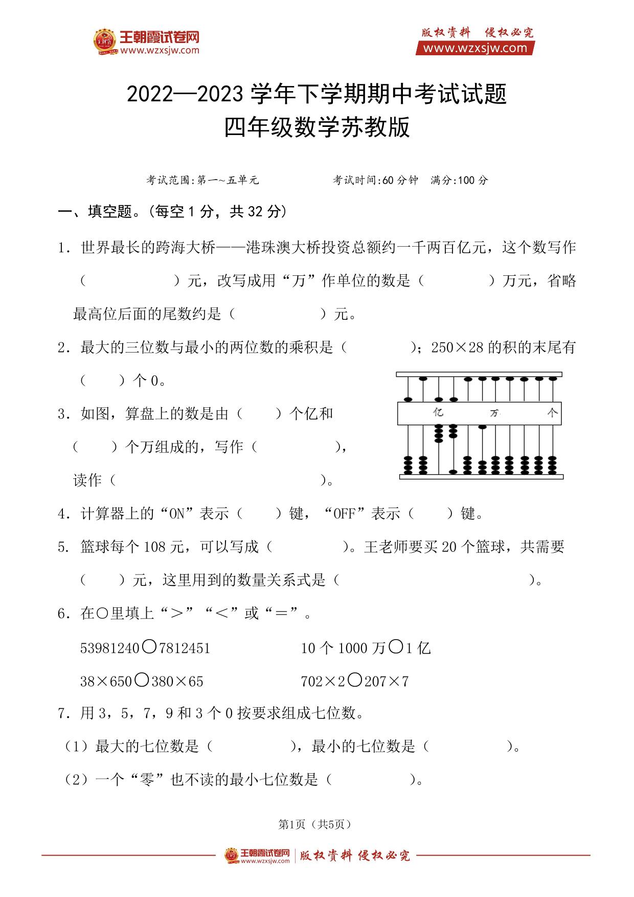 2022-2023学年下学期期中考试试题四年级数学(苏教版)