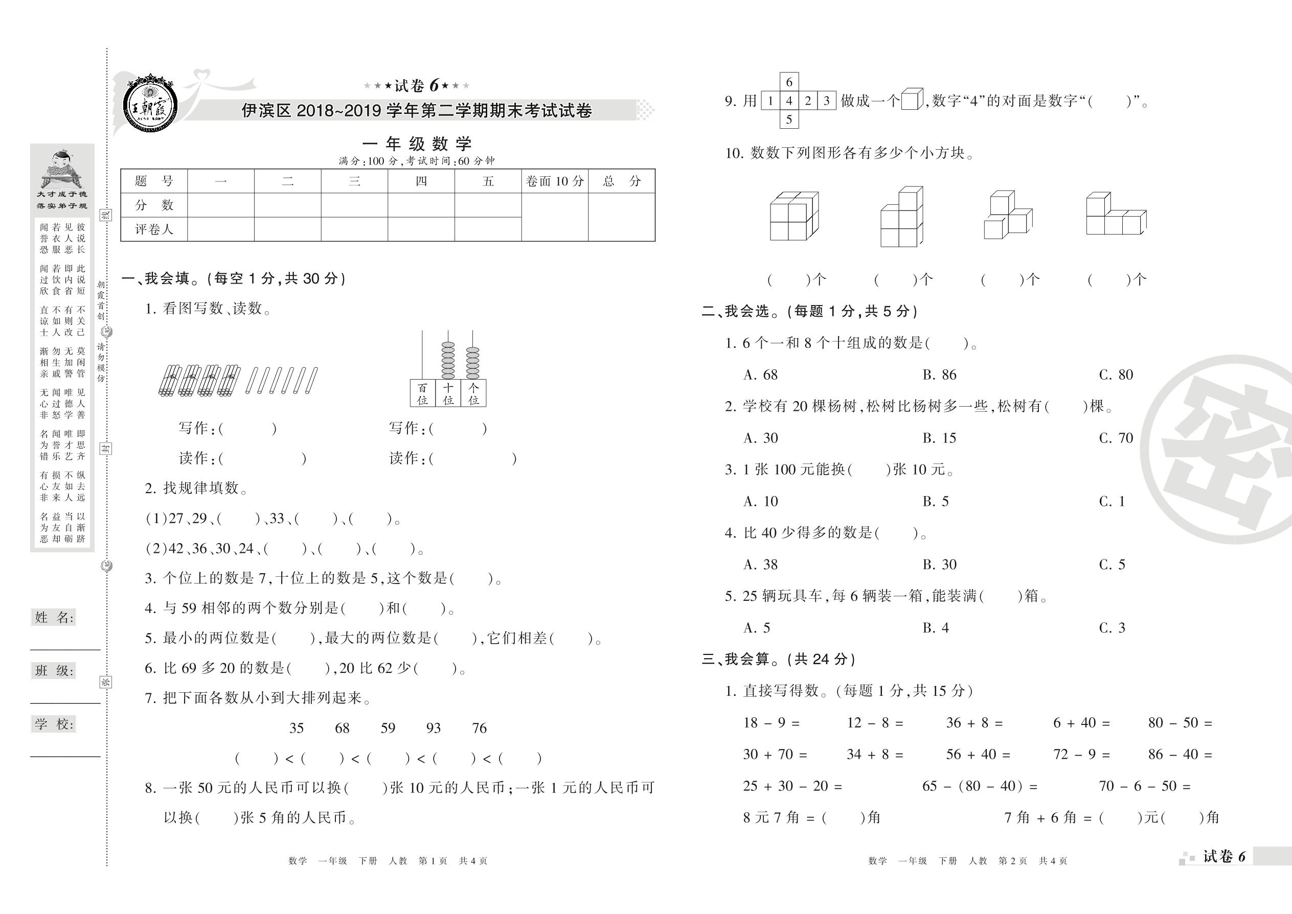 2018-2019学年第二学期洛阳市伊滨区一年级数学试卷(人教版)【6】