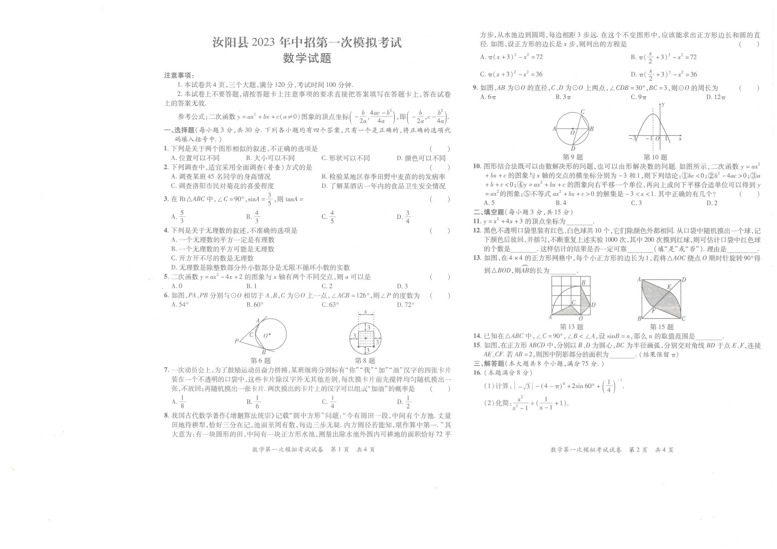 洛阳市汝阳县2023年中招第一次模拟考试数学试题