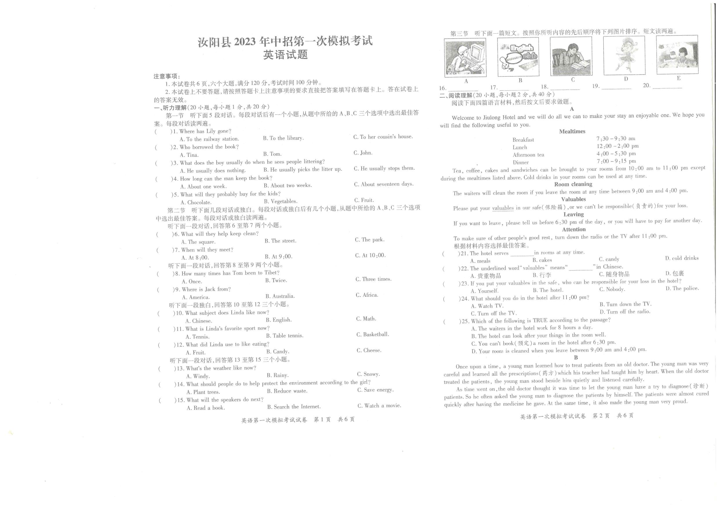 洛阳市汝阳县2023年中招第一次模拟考试英语试题【无听力音频】