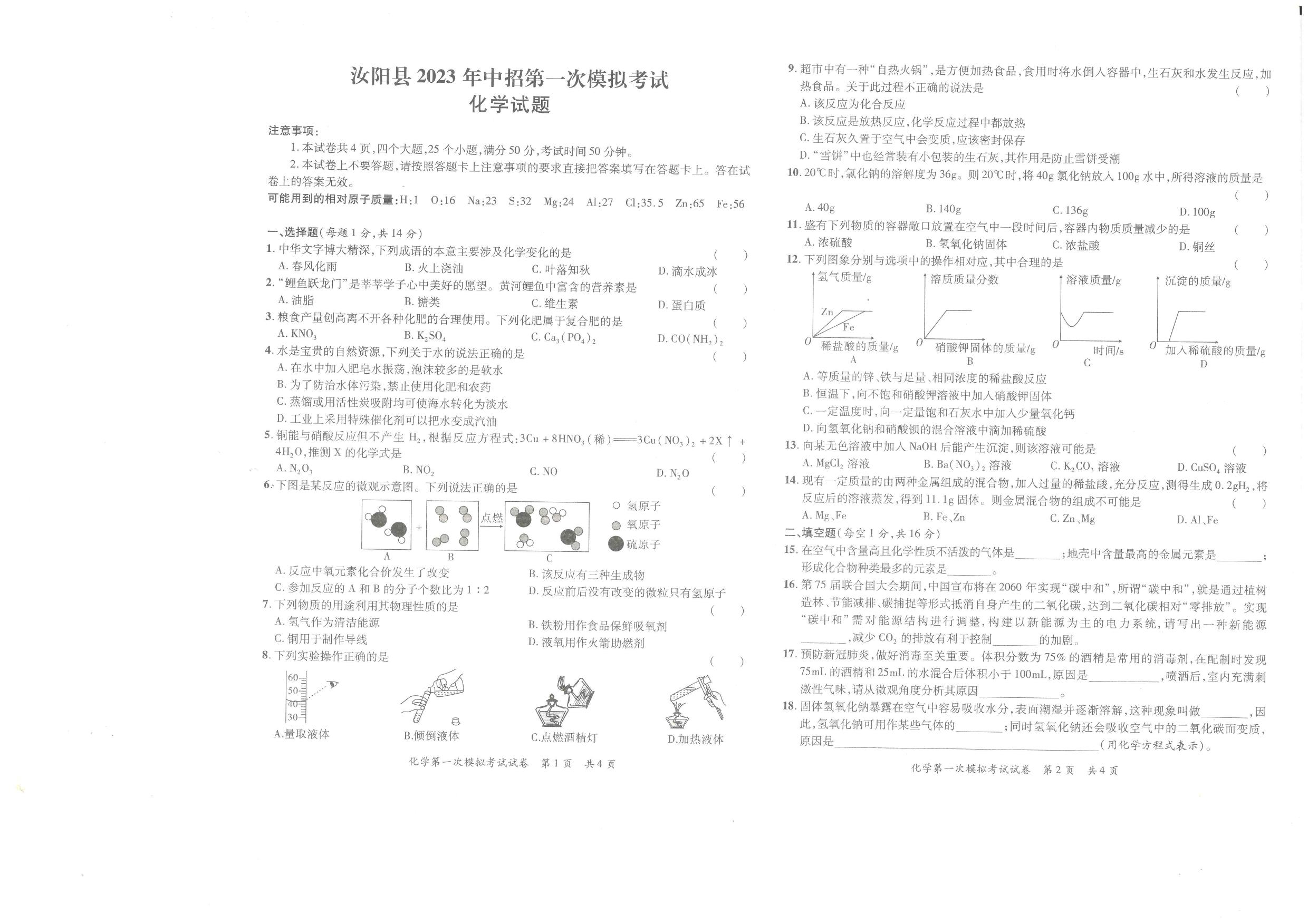 洛阳市汝阳县2023年中招第一次模拟考试化学试题