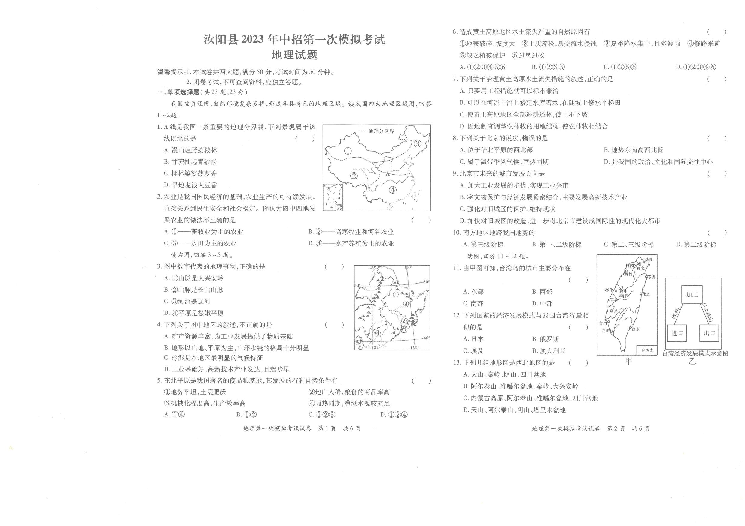 洛阳市汝阳县2023年中招第一次模拟考试地理试题