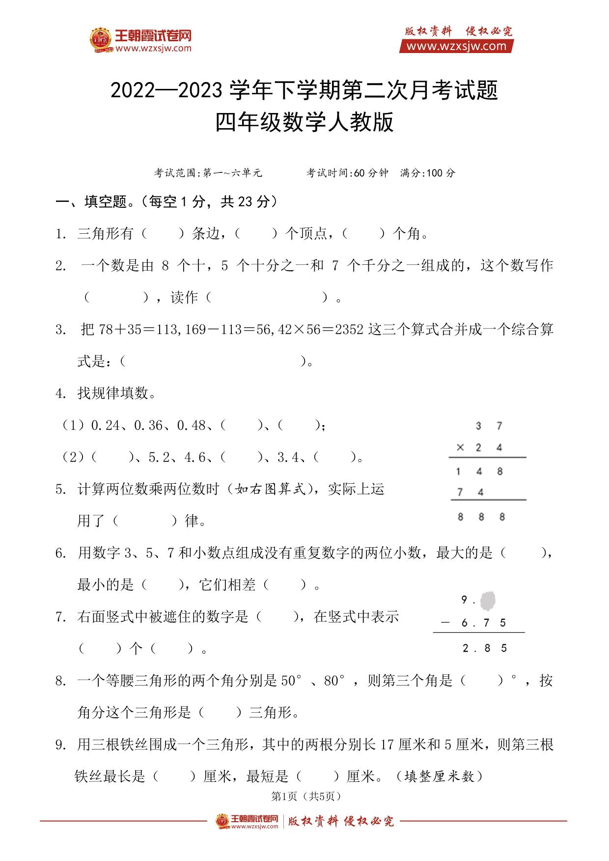 2022-2023学年下学期第二次月考试题四年级数学(人教版)