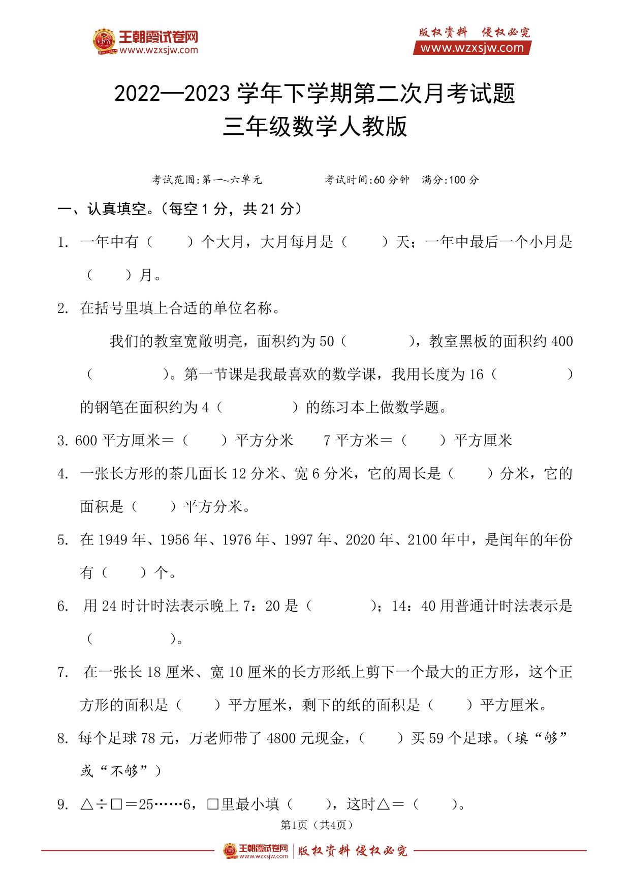 2022-2023学年下学期第二次月考试题三年级数学(人教版)