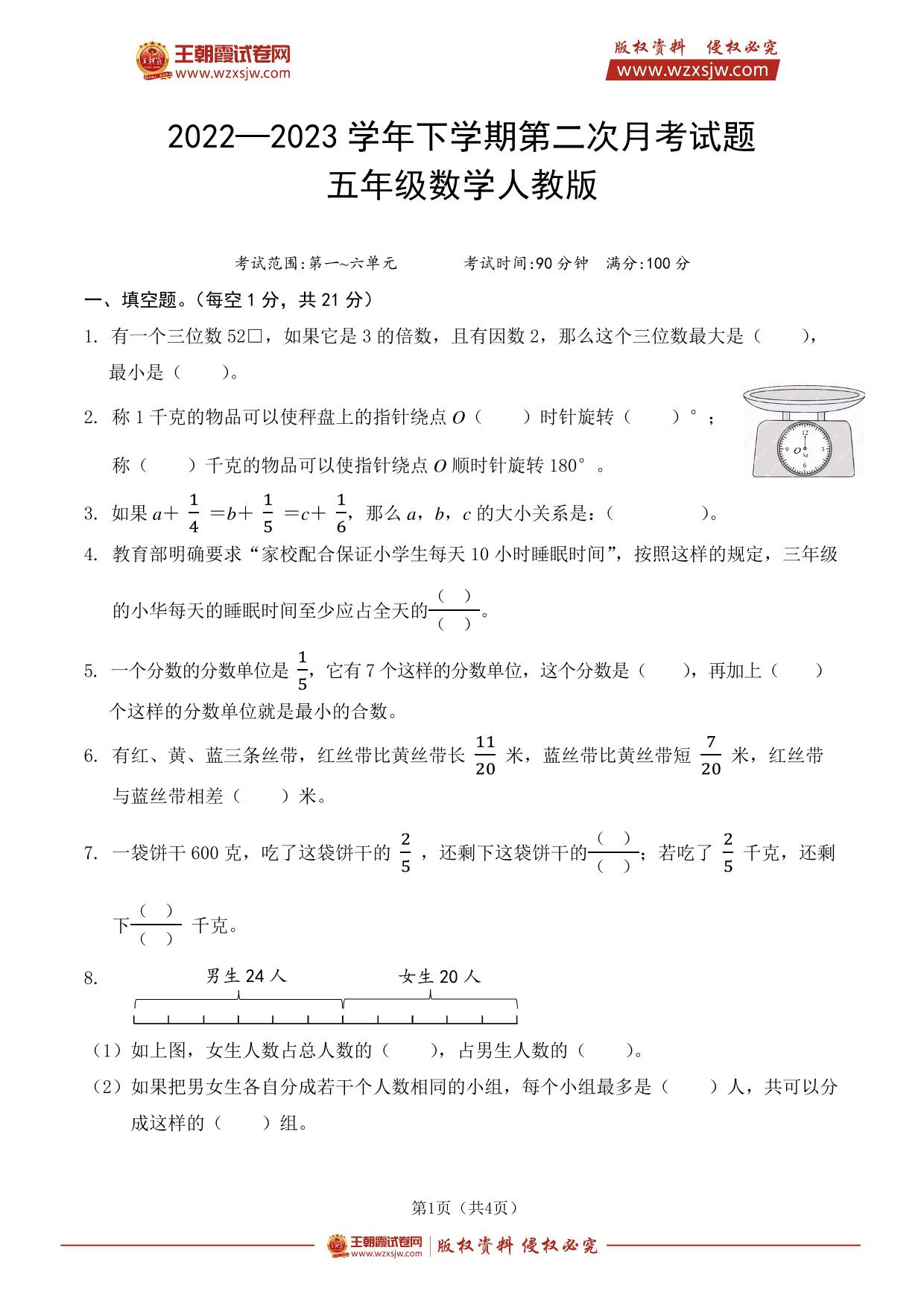 2022-2023学年下学期第二次月考试题五年级数学(人教版)