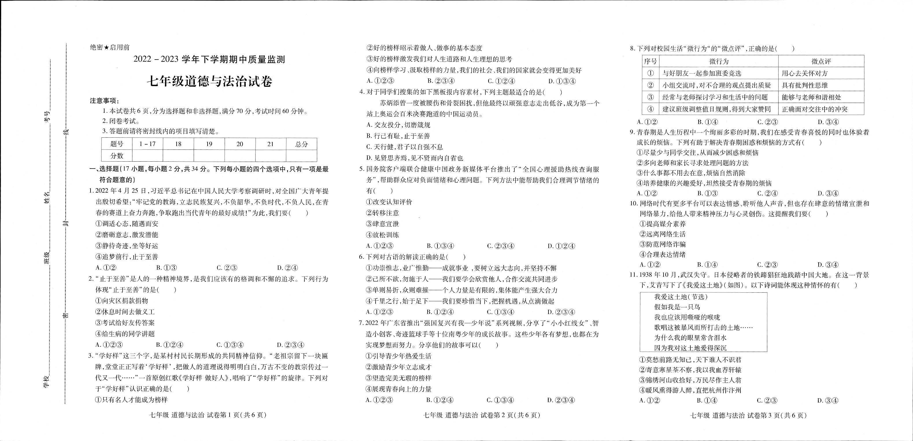 河南省洛阳市伊滨区、瀍河区2022-2023学年下学期期中质量检测试卷七年级道德与法治(人教版)