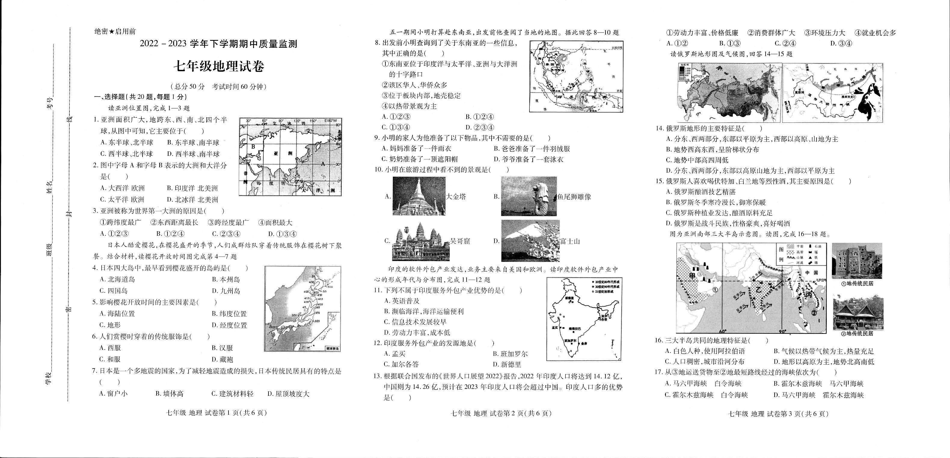 七年级地理人教版下册期中卷