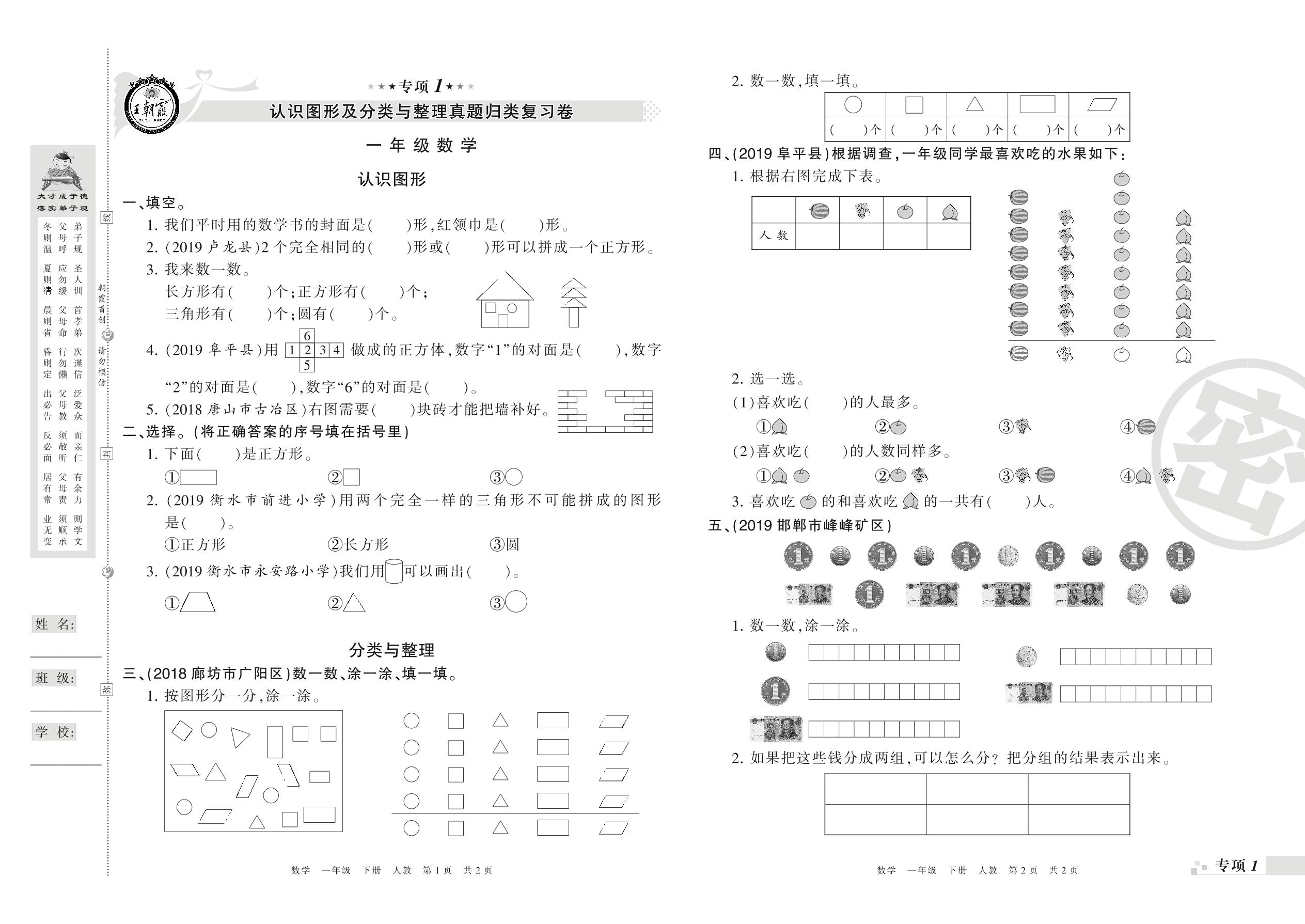 王朝霞期末专项卷——认识图形及分类与整理、100以内数的认识真题归类复习卷一年级下册数学(人教版)【0】