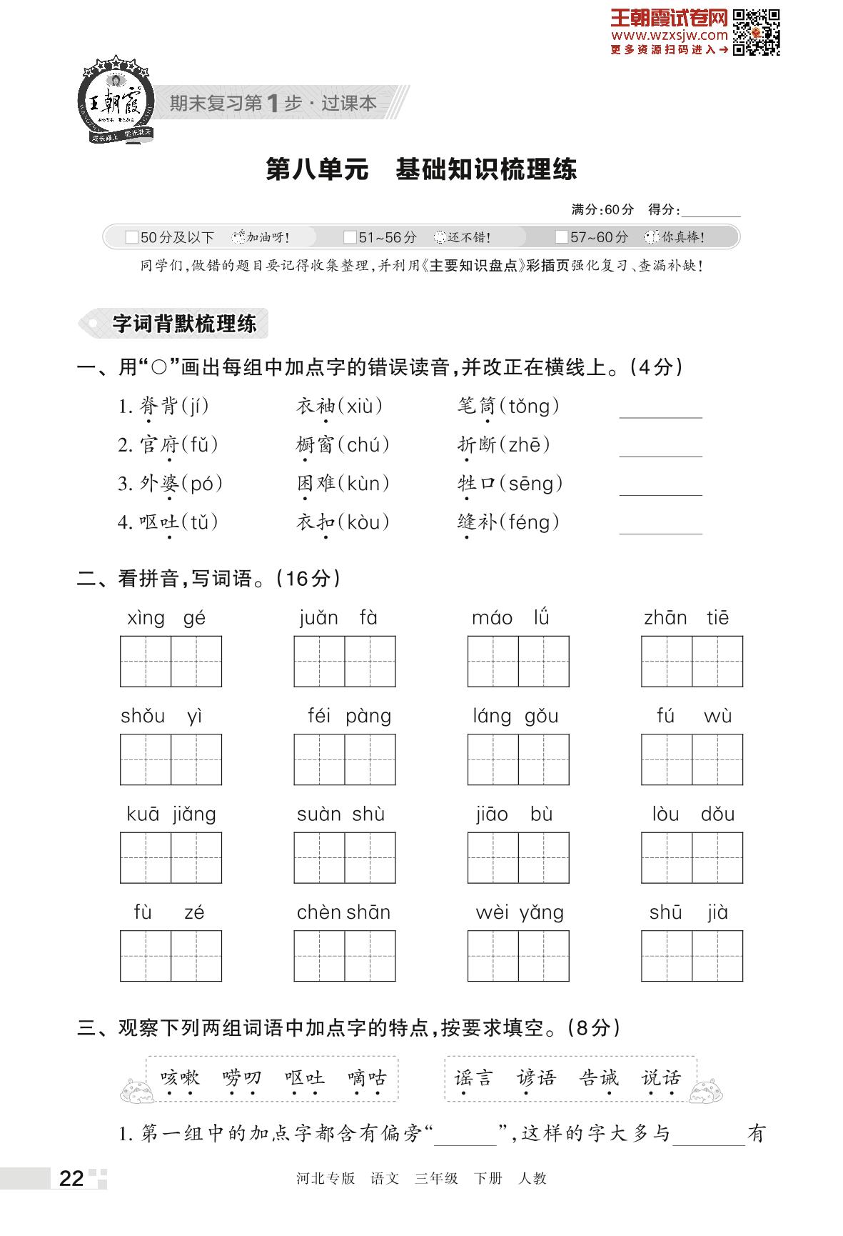 王朝霞期末过课本——第八单元 基础知识梳理练三年级下册语文(人教版)_R230419135205585