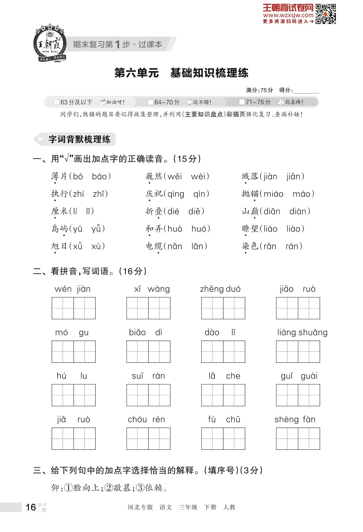王朝霞期末过课本——第六单元 基础知识梳理练三年级下册语文(人教版)_R230419135206683