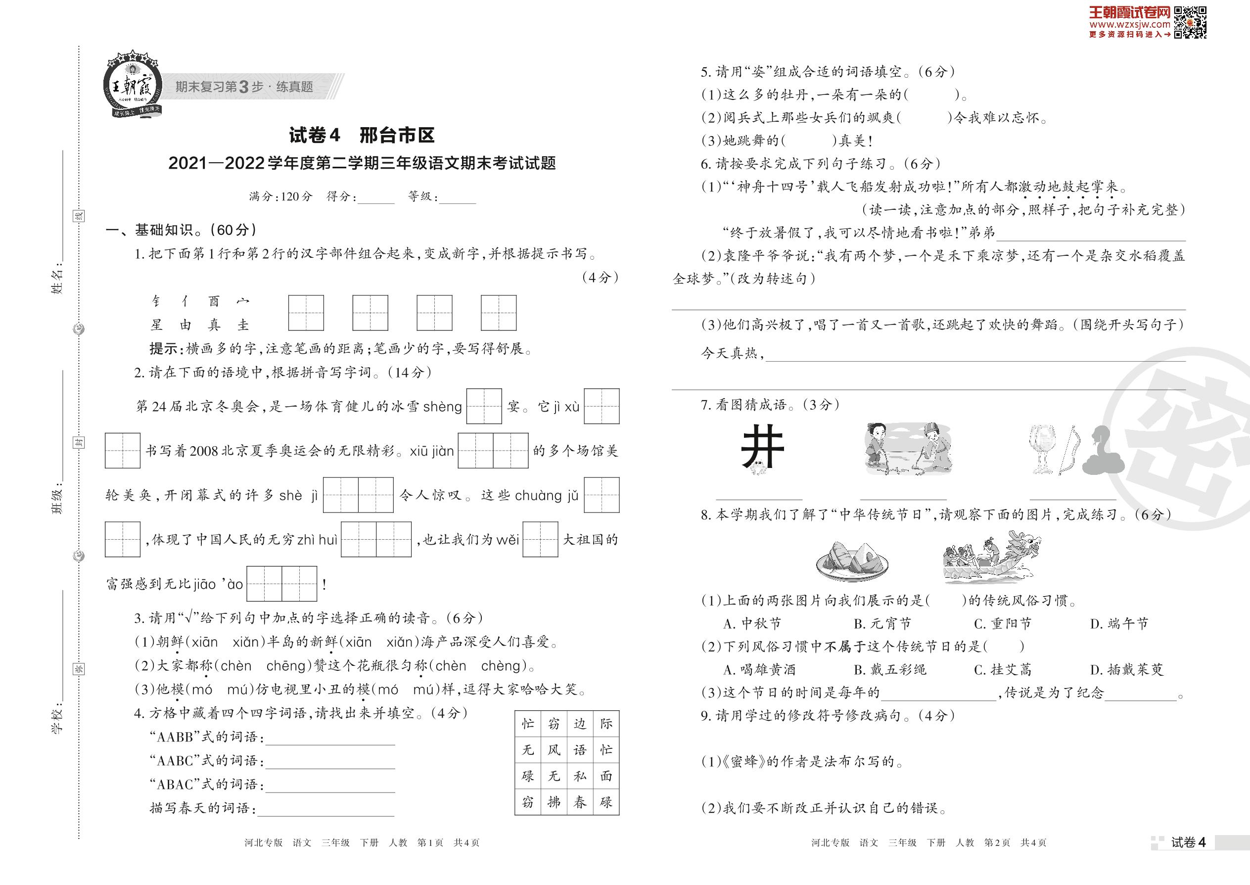 三年级语文人教版下册期末卷