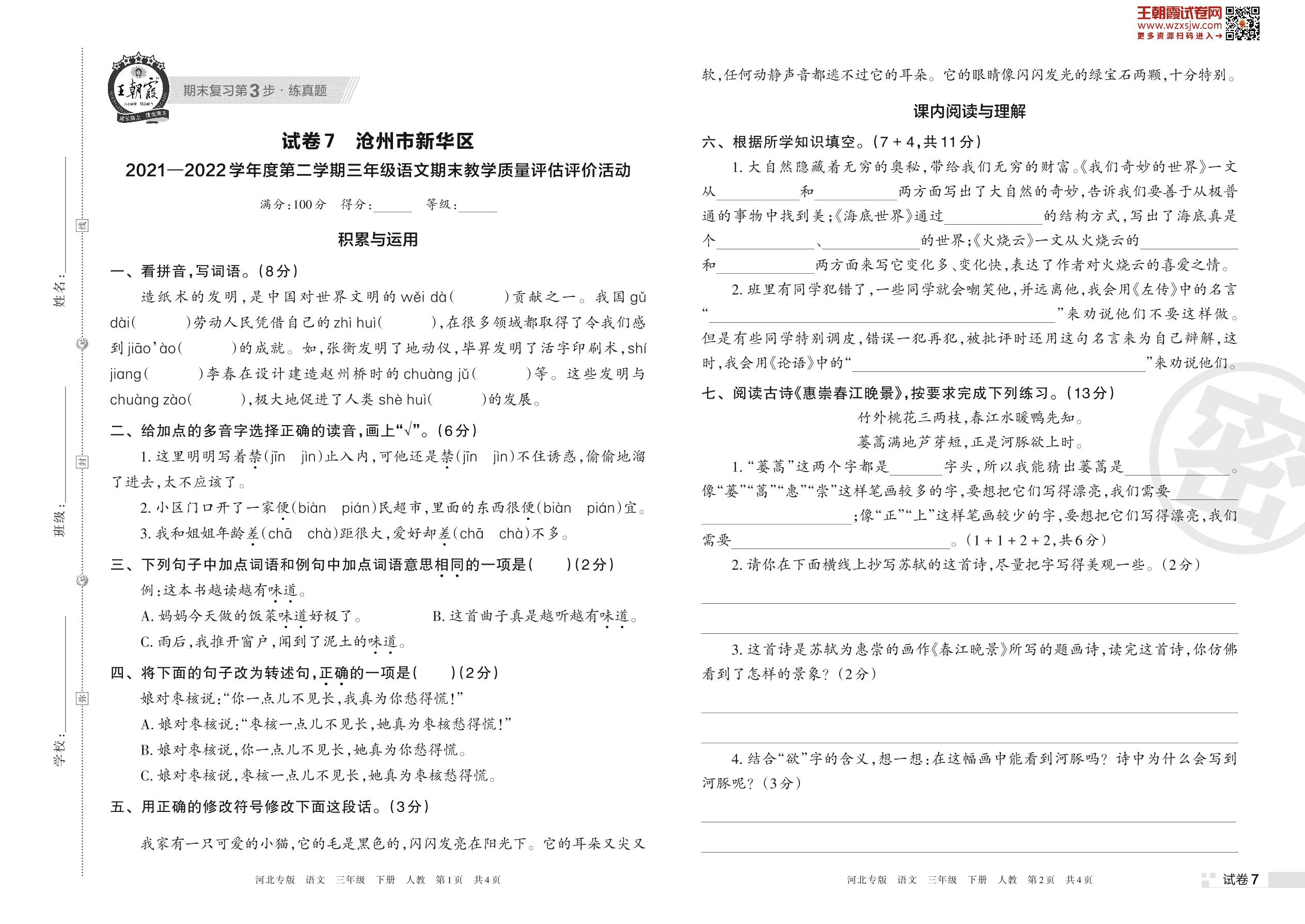 沧州市新华区2021—2022学年度第二学期三年级语文期末教学质量评估评价活动(人教版)【7】