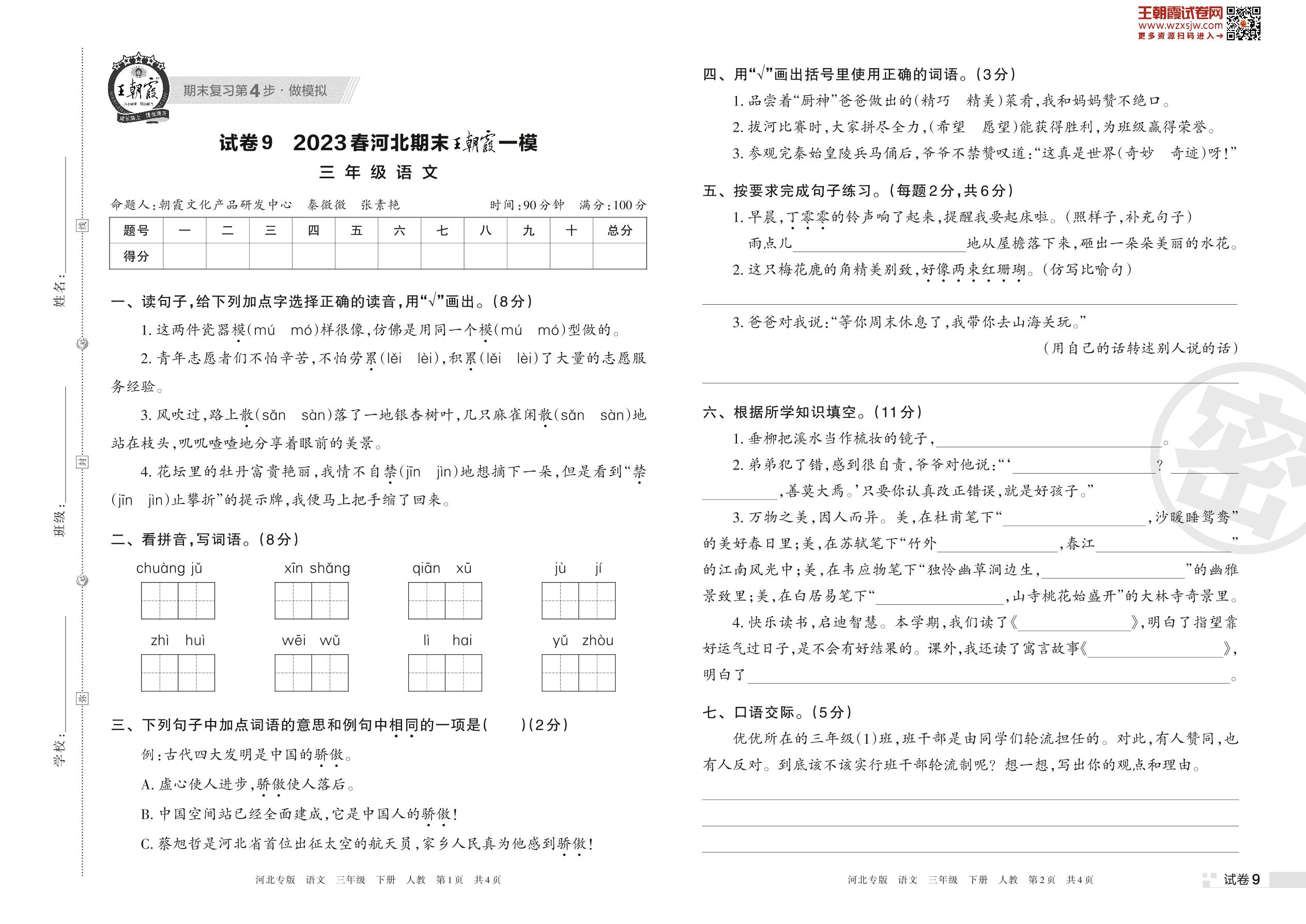 王朝霞期末模拟卷三年级下册语文(人教版)【9】