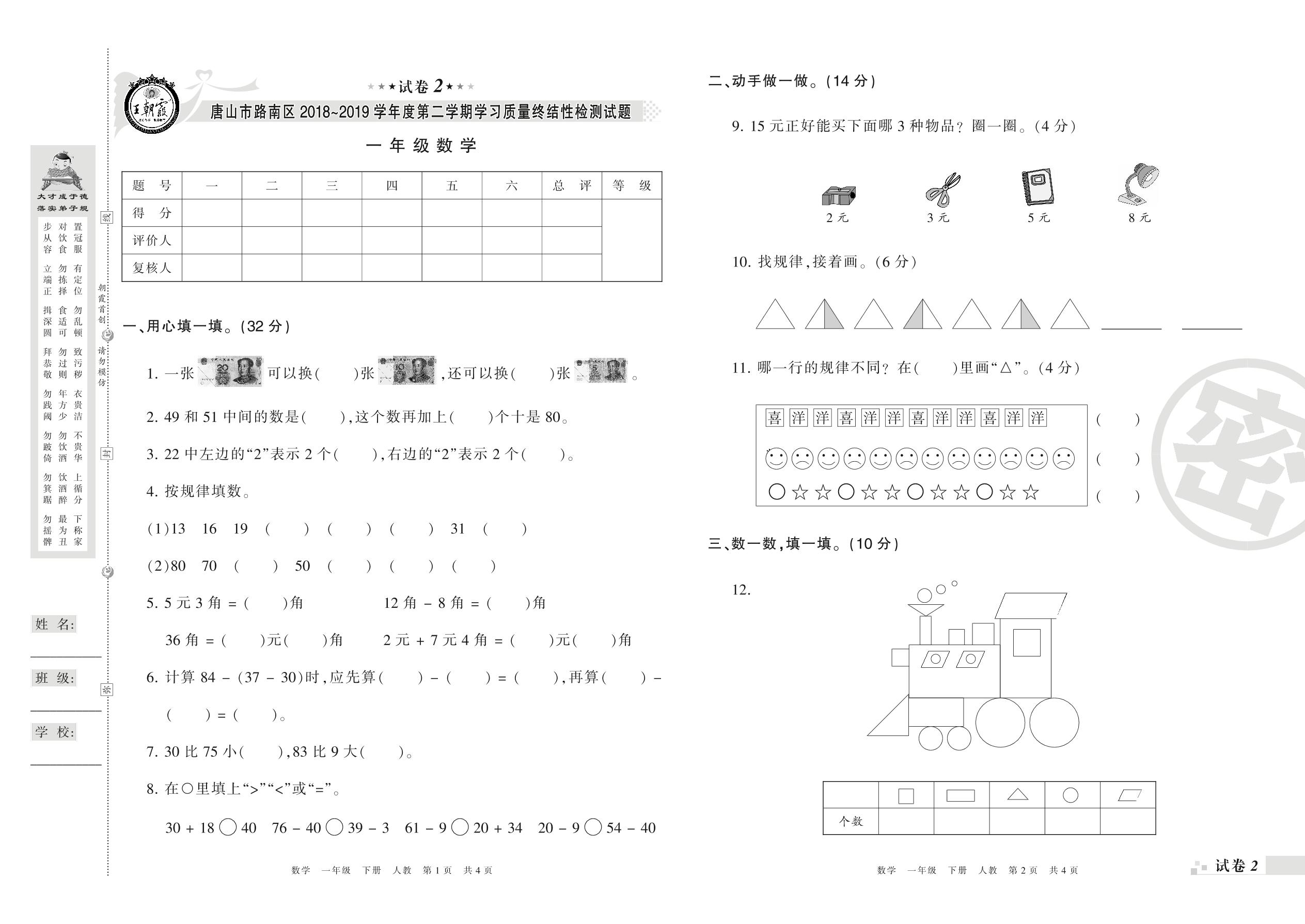 2018-2019学年第二学期唐山市路南区一年级数学试卷(人教版)【2】