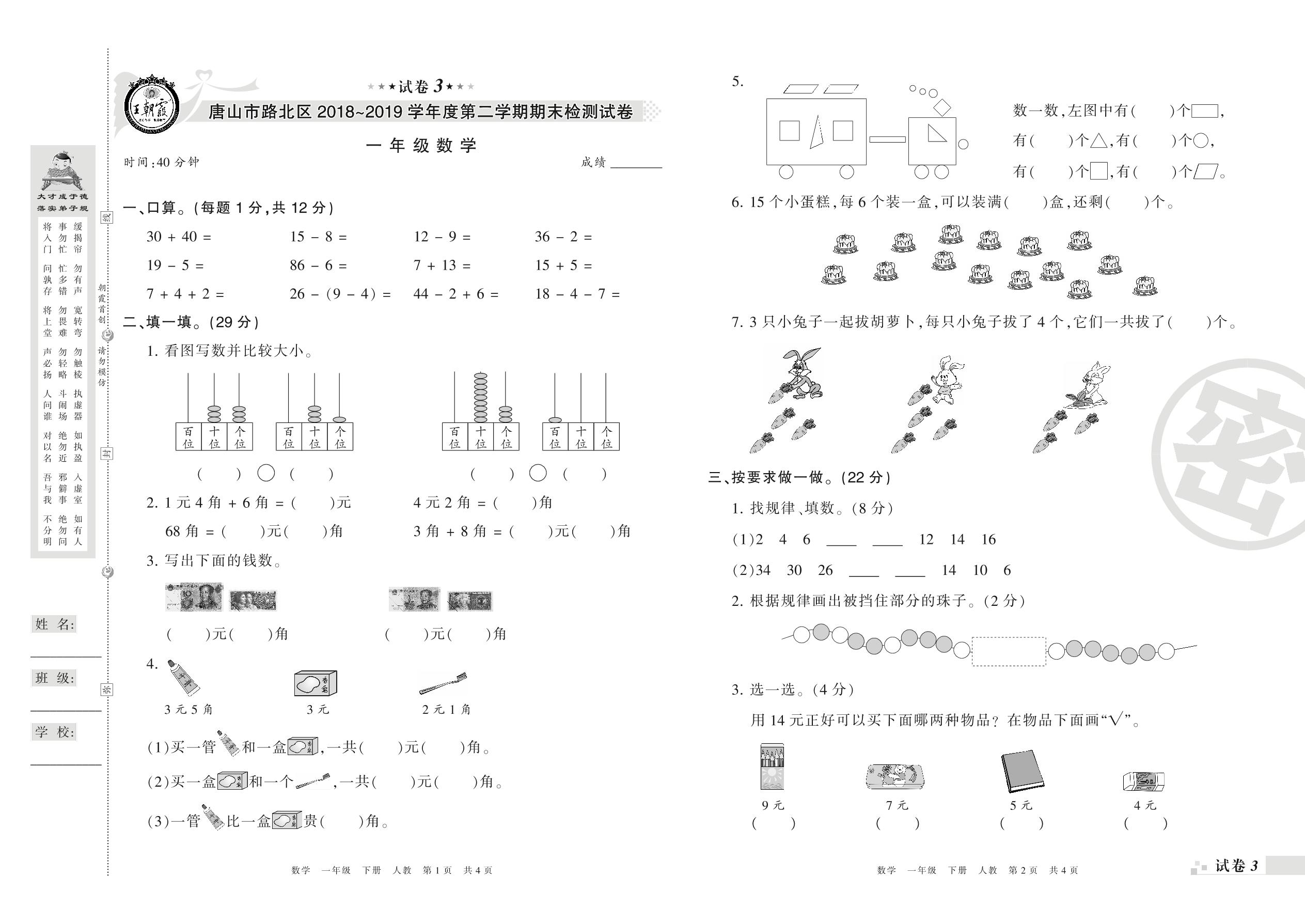 2018-2019学年第二学期唐山市路北区一年级数学试卷(人教版)【3】