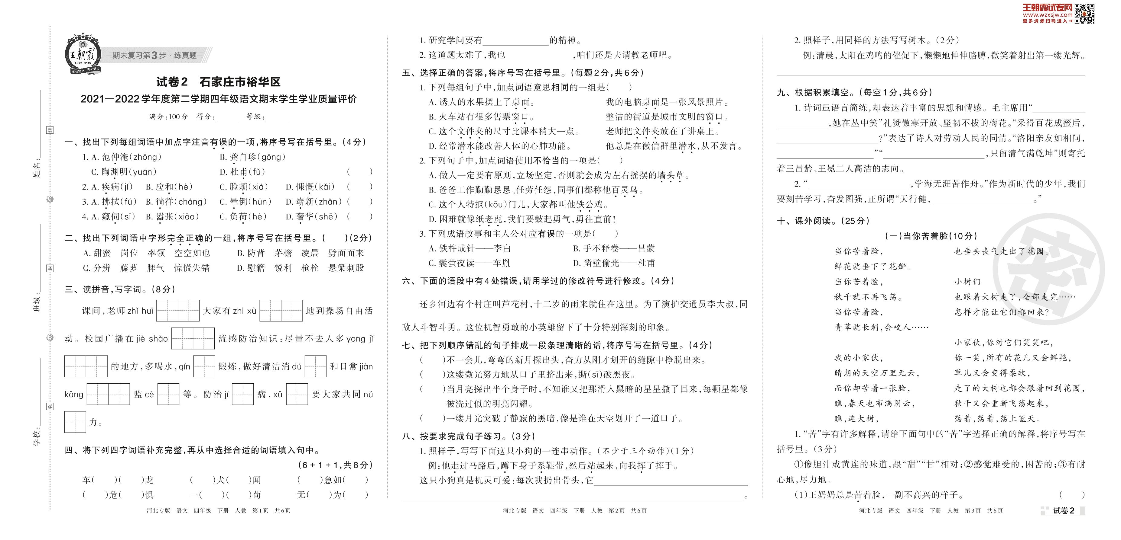 石家庄市裕华区2021—2022学年度第二学期四年级语文期末学生学业质量评价(人教版)【2】