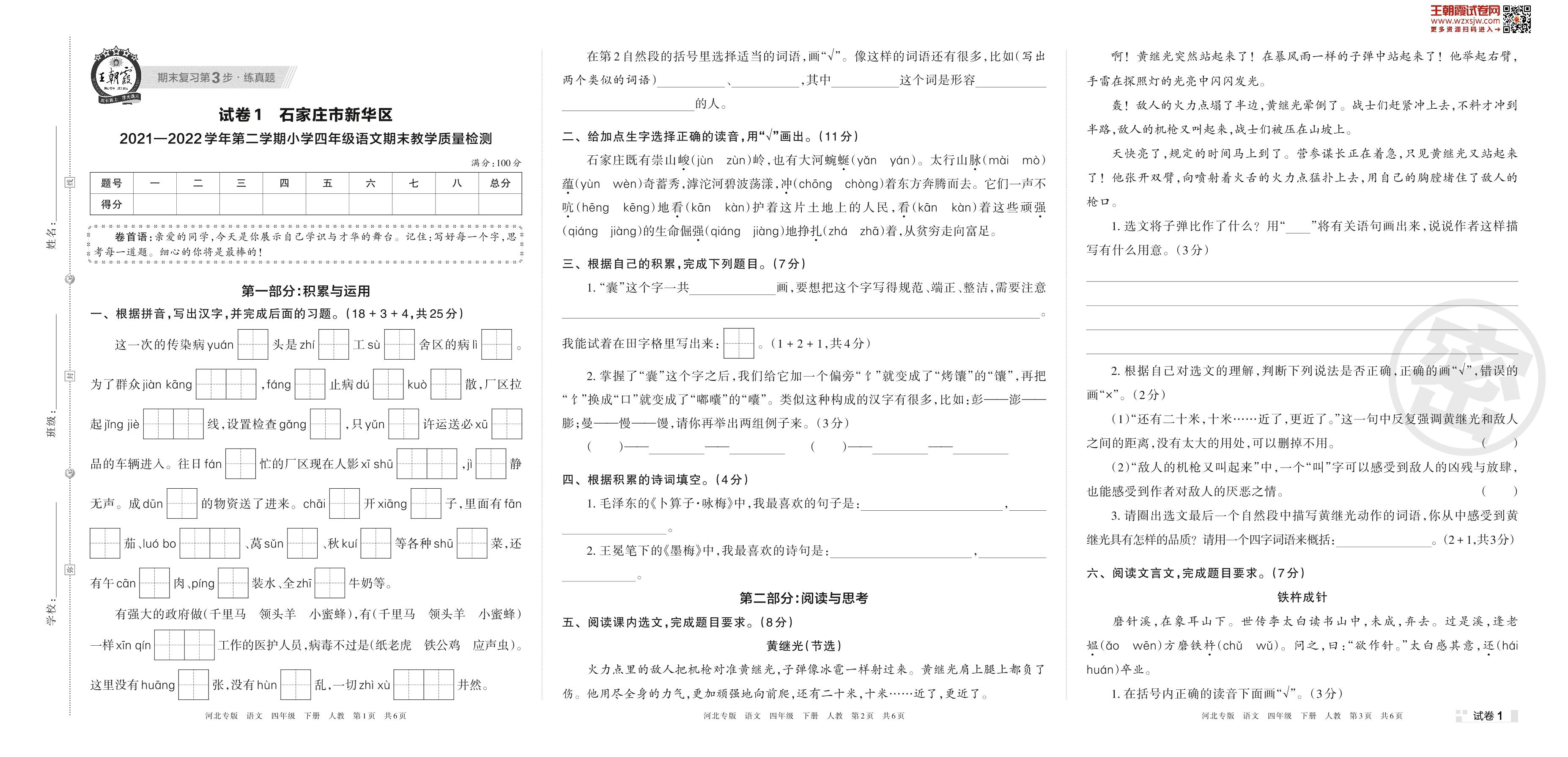 石家庄市新华区2021—2022学年第二学期小学四年级语文期末教学质量检测(人教版)【1】