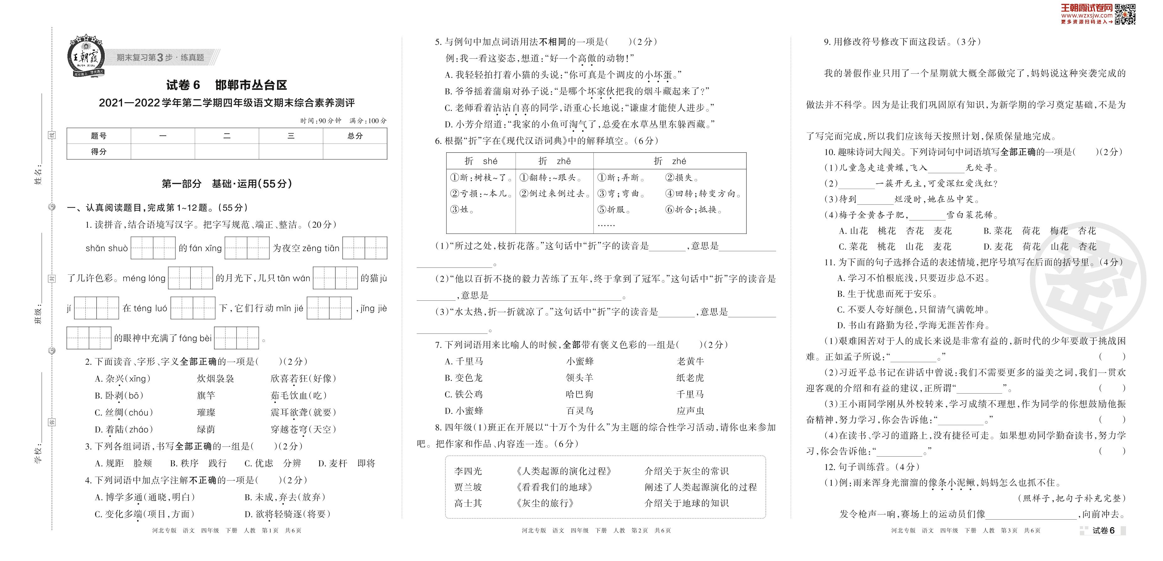 邯郸市丛台区2021—2022学年第二学期四年级语文期末综合素养测评(人教版)【6】