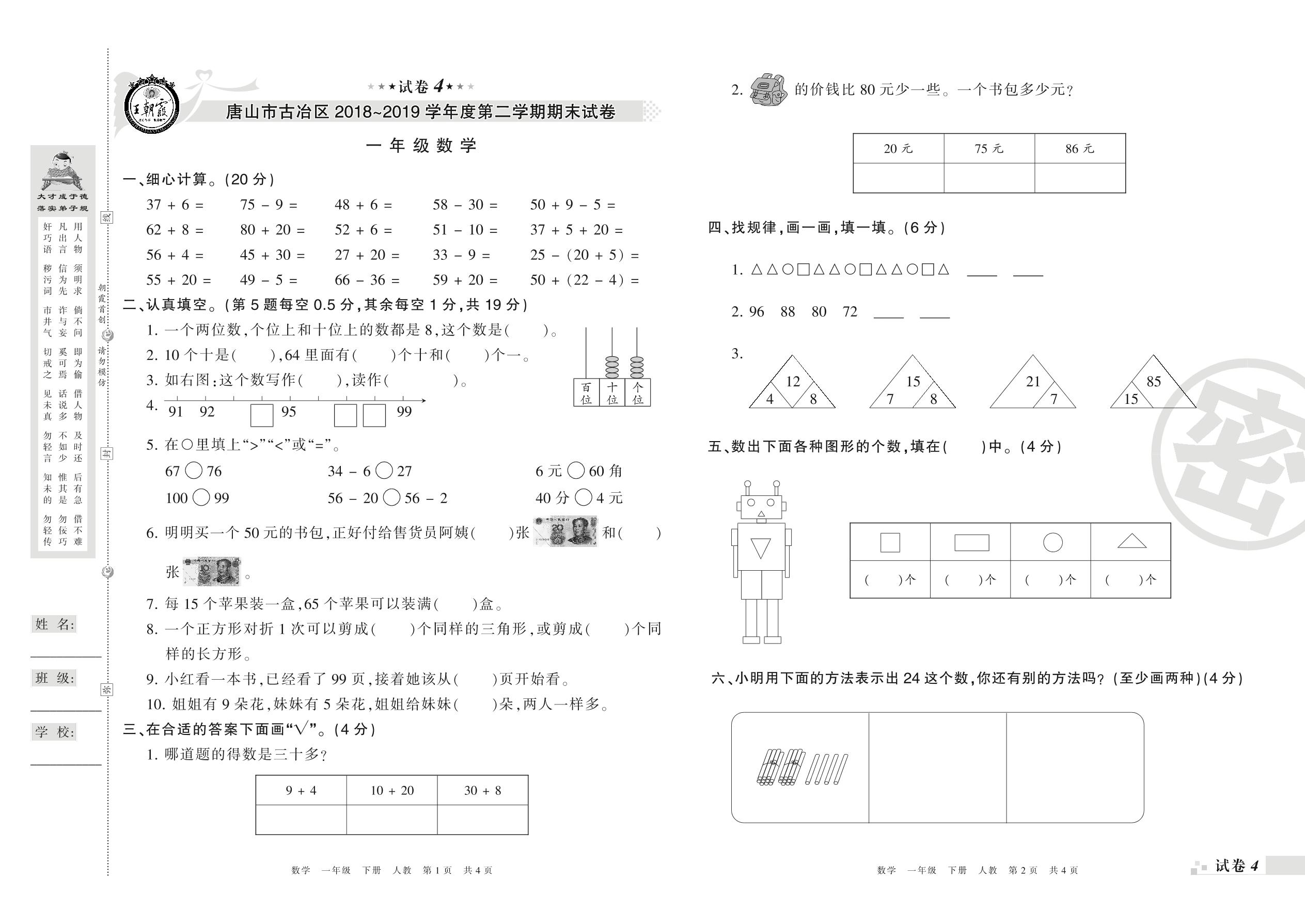2018-2019学年第二学期唐山市古冶区一年级数学试卷(人教版)【4】