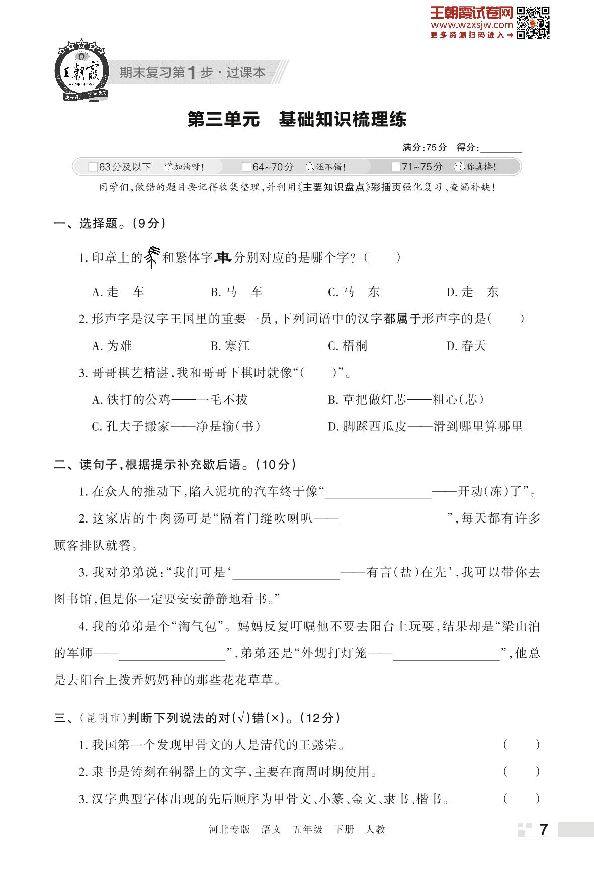 王朝霞期末过课本——第三单元 基础知识梳理练五年级下册语文(人教版)_R230419142931785