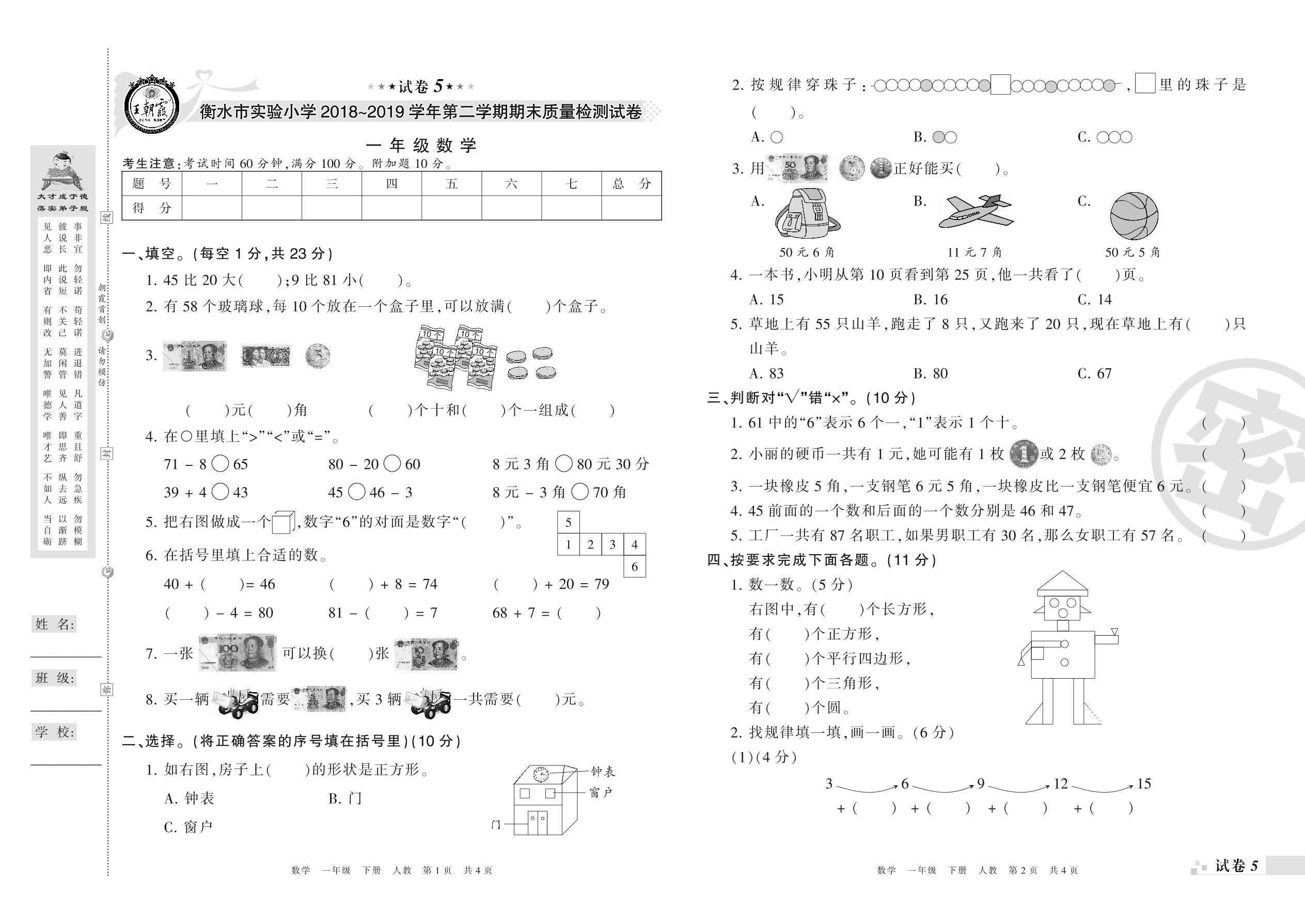 2018-2019学年第二学期衡水市实验小学一年级数学试卷(人教版)【5】