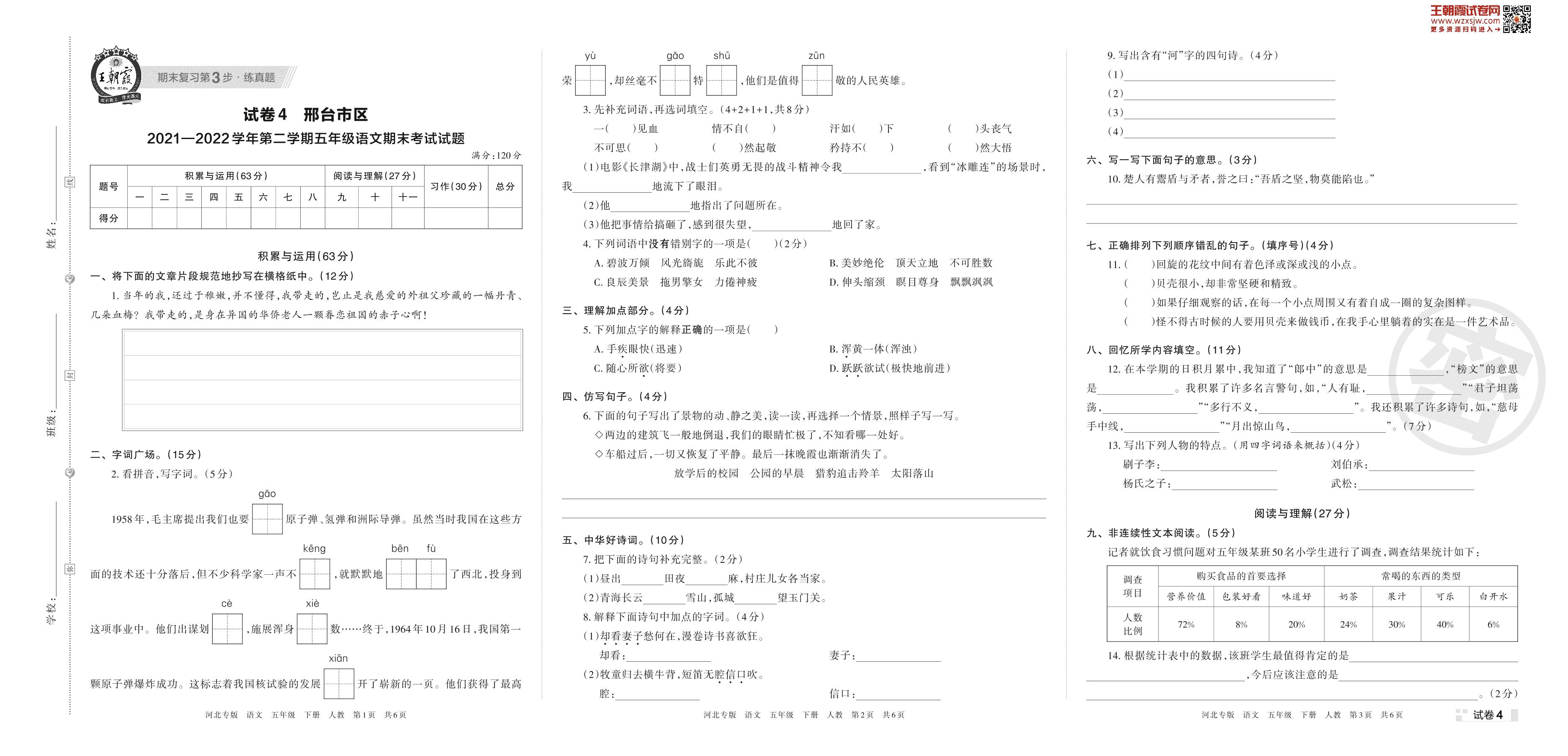 邢台市区2021—2022学年第二学期五年级语文期末考试试题(人教版)【4】