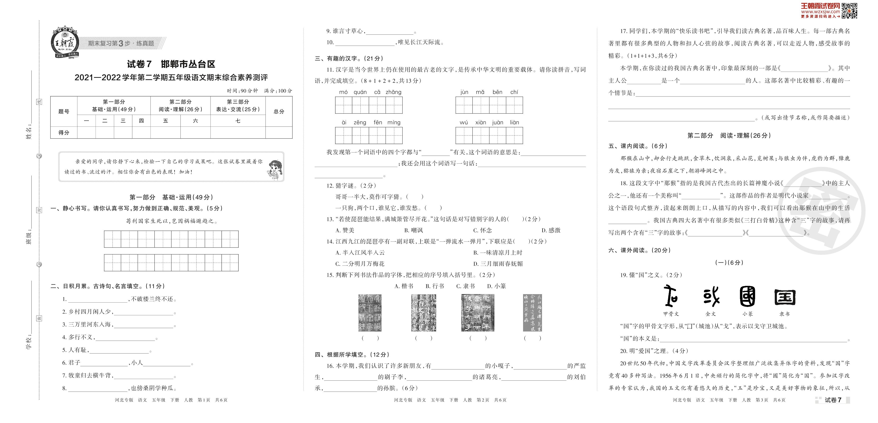 邯郸市丛台区2021—2022学年第二学期五年级语文期末综合素养测评(人教版)【7】