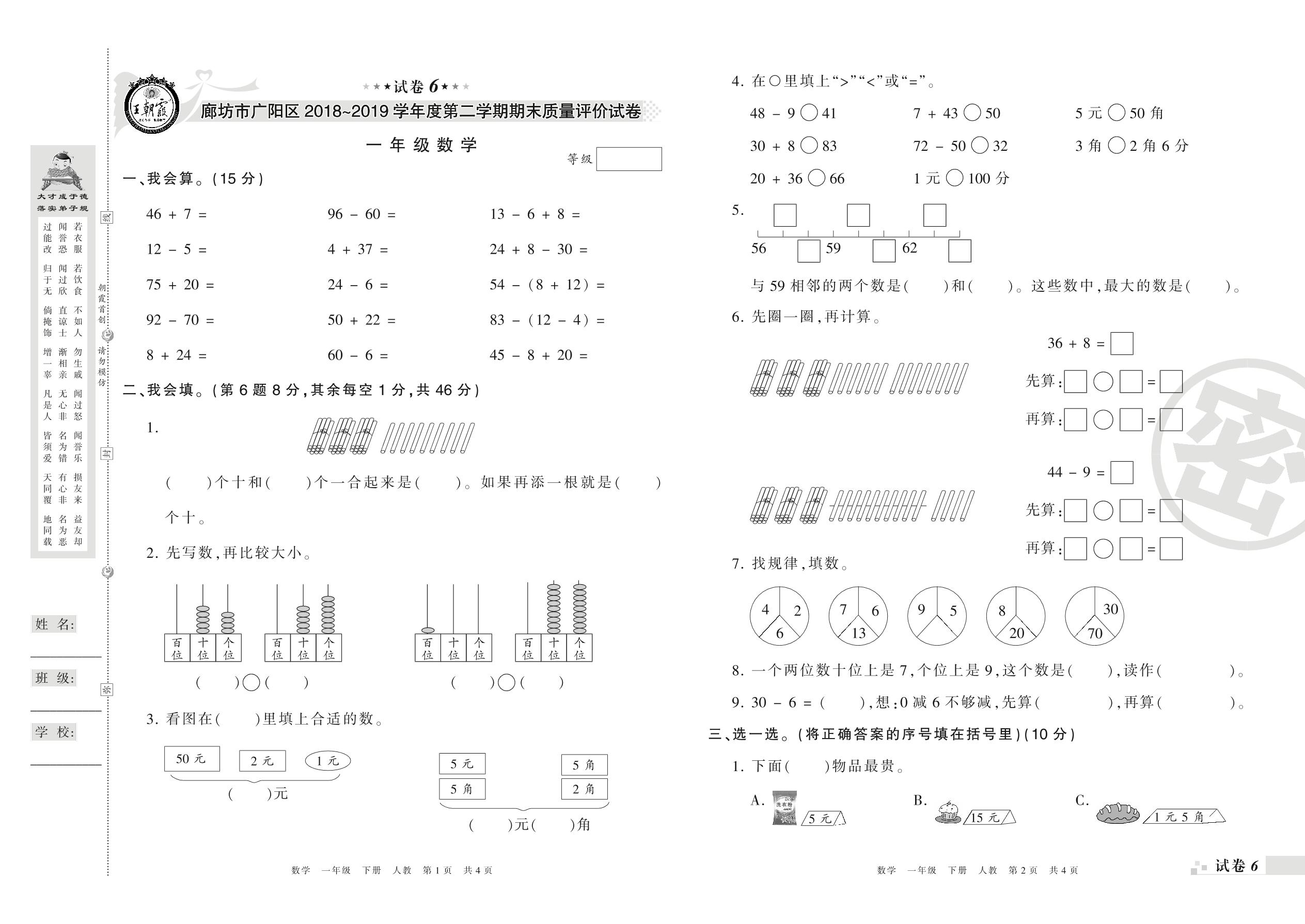 2018-2019学年第二学期廊坊市广阳区一年级数学试卷(人教版)【6】
