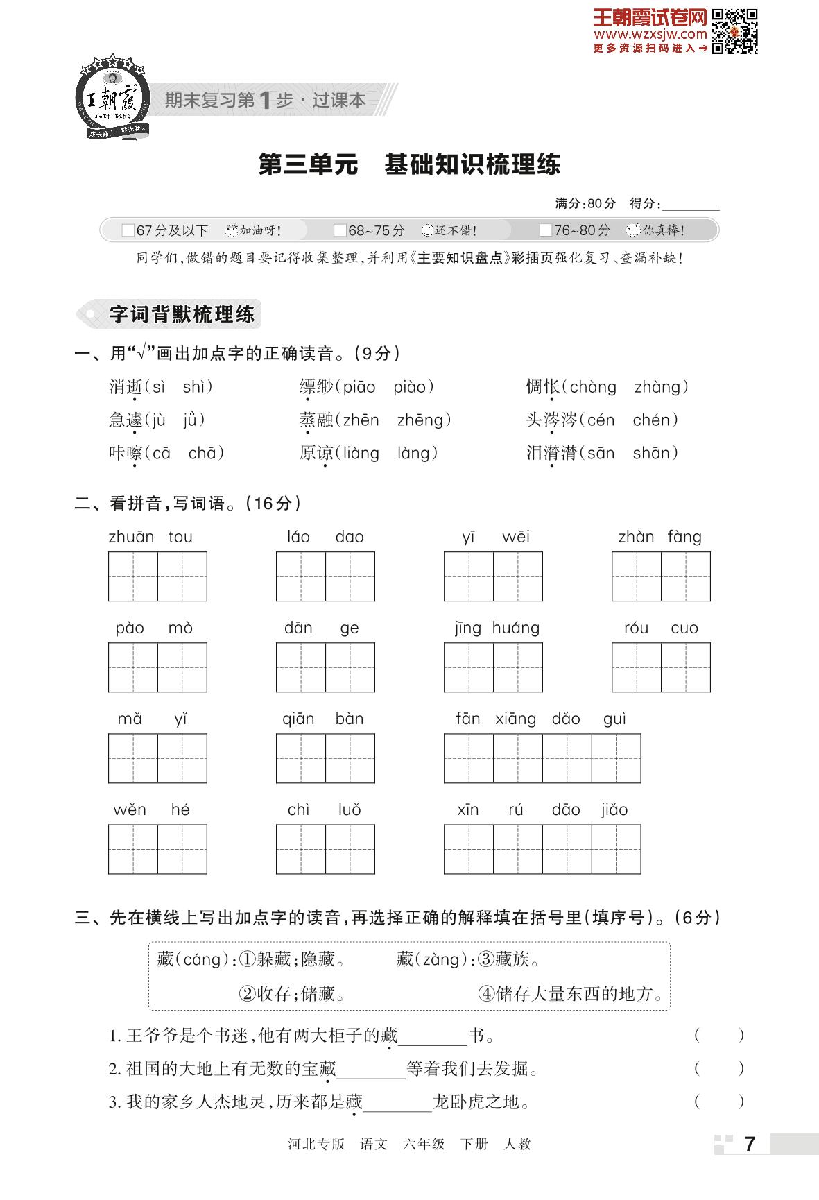 王朝霞期末过课本——第三单元 基础知识梳理练六年级下册语文(人教版)_R230419143441868