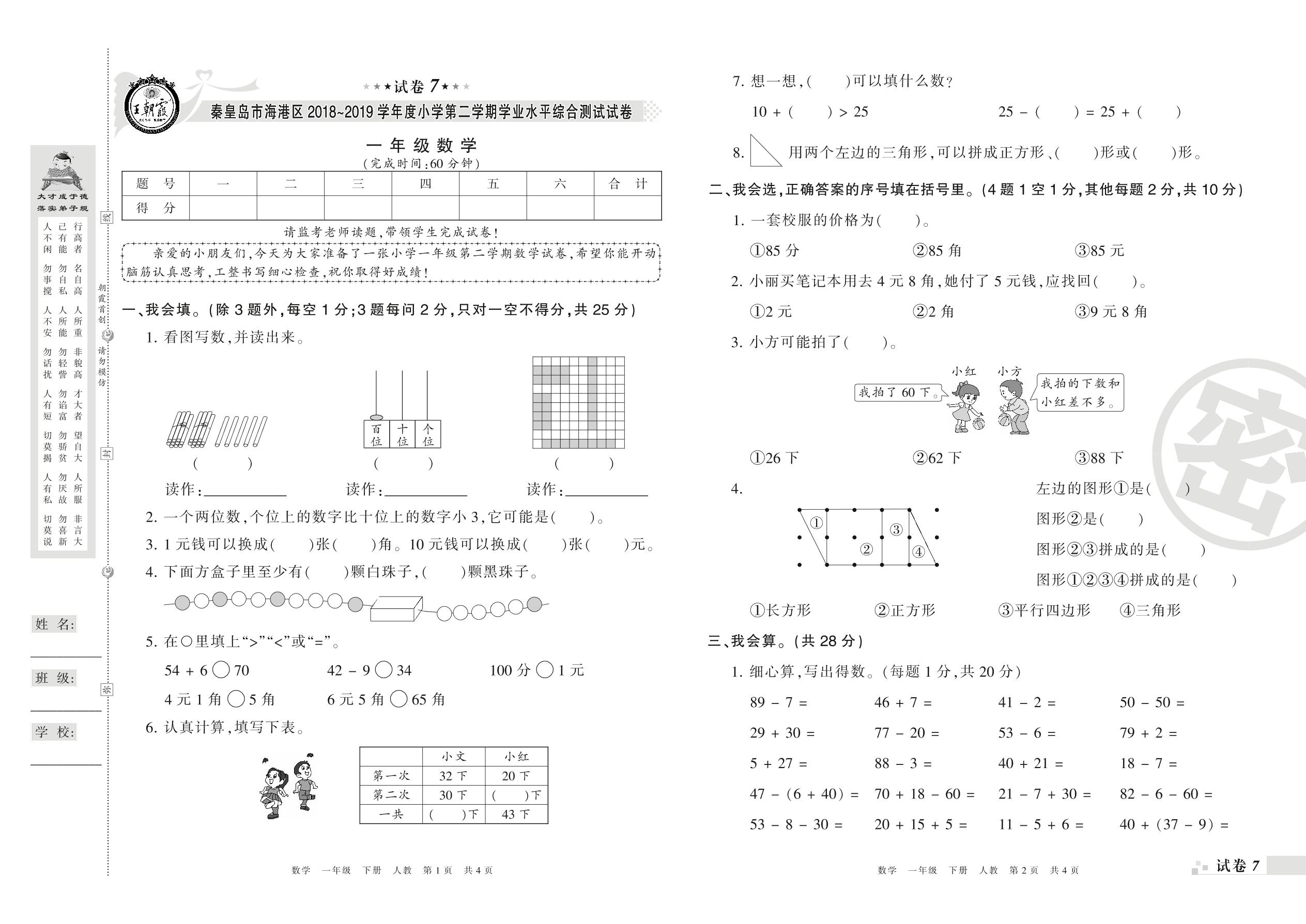 2018-2019学年第二学期秦皇岛市海港区一年级数学试卷(人教版)【7】