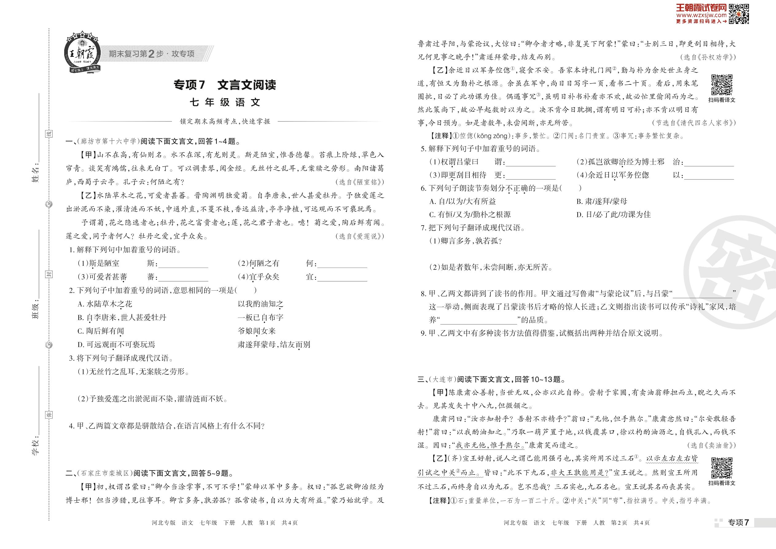 王朝霞期末专项卷——文言文阅读七年级下册语文(人教版)【7】