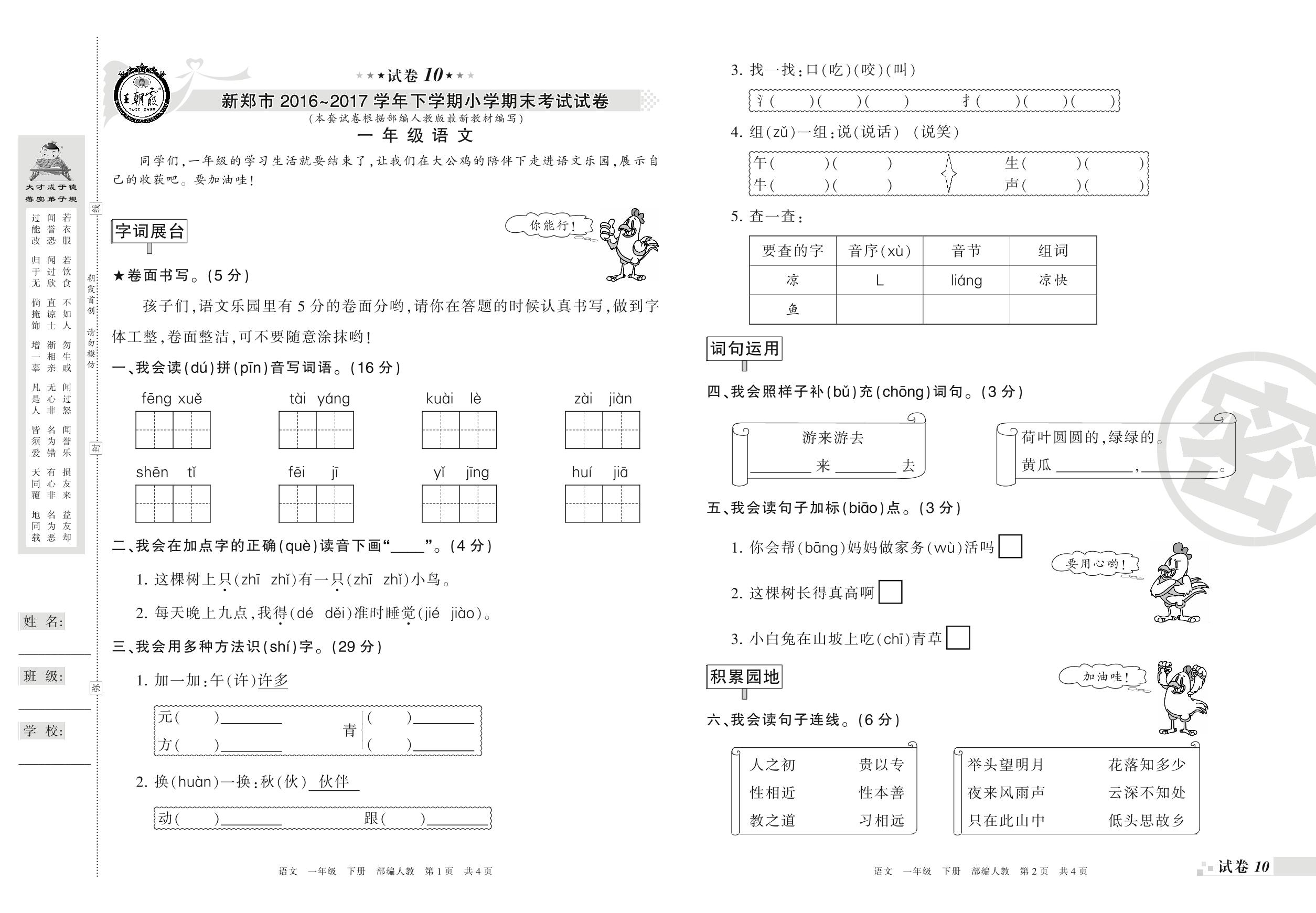 2016-2017学年第二学期新郑市一年级语文试卷(人教版)【10】