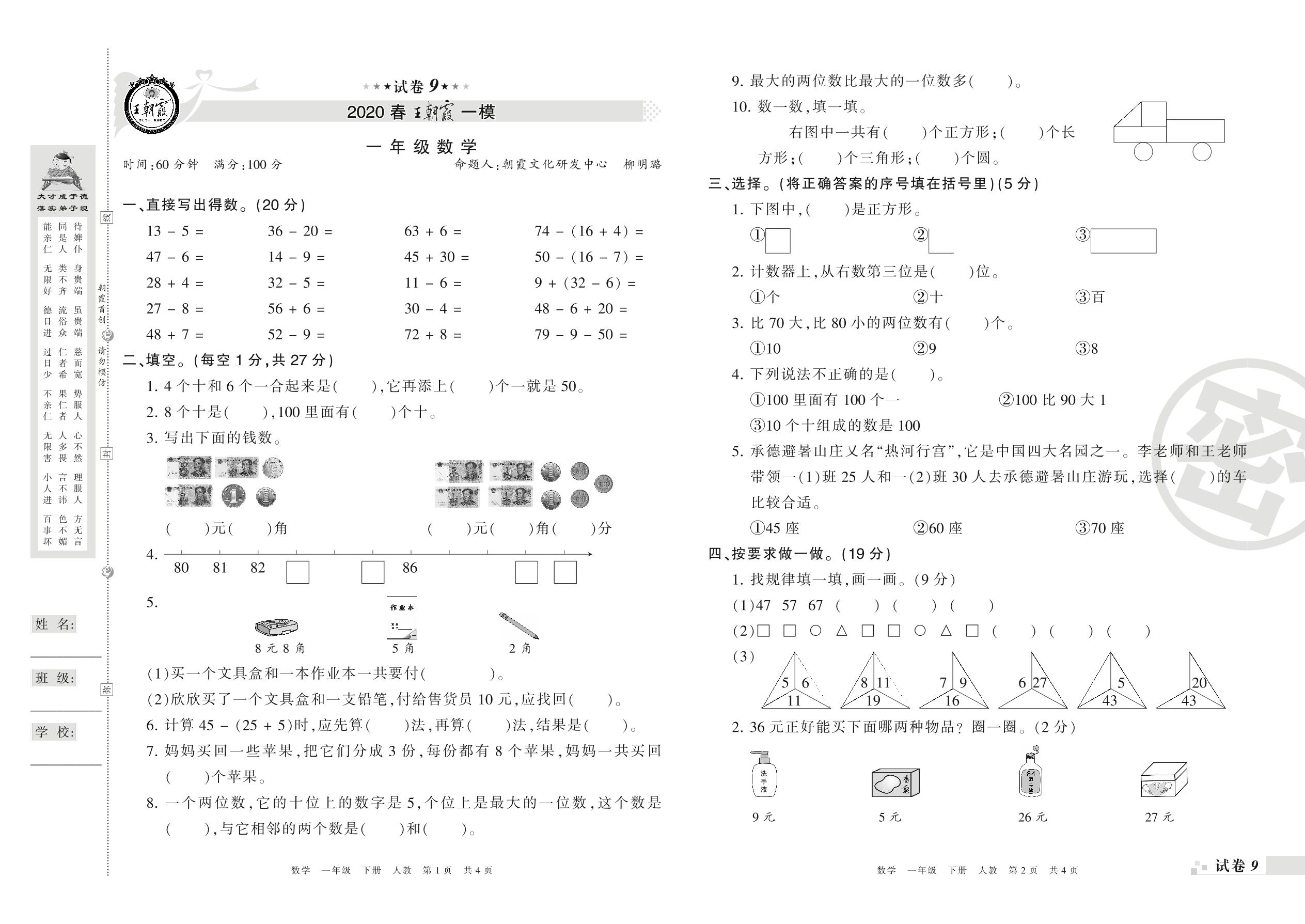 王朝霞期末模拟卷一年级下册数学(人教版)_R210802213951【9】