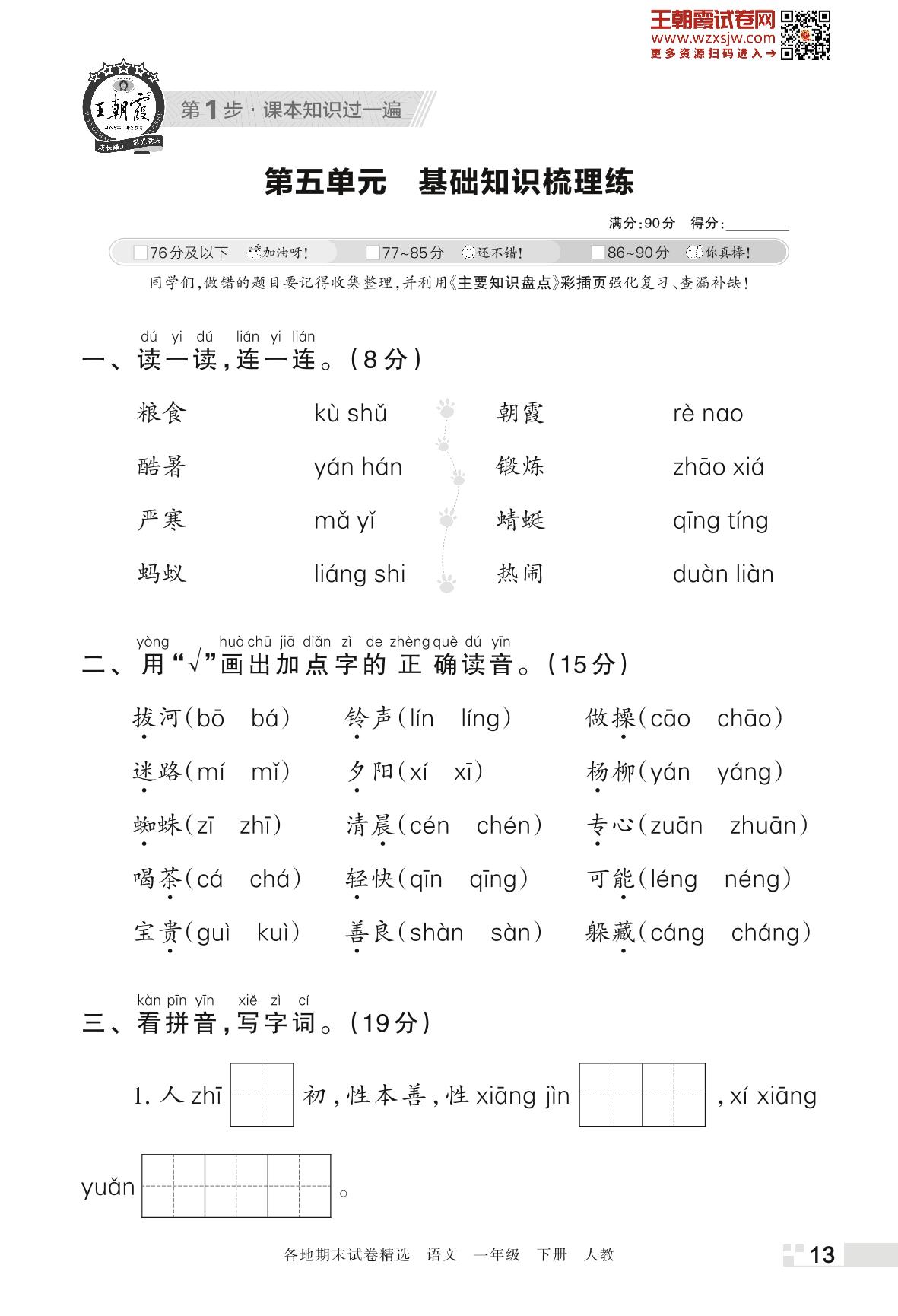 王朝霞期末过课本——第五单元 基础知识梳理练一年级下册语文(人教版)_R230419145036992