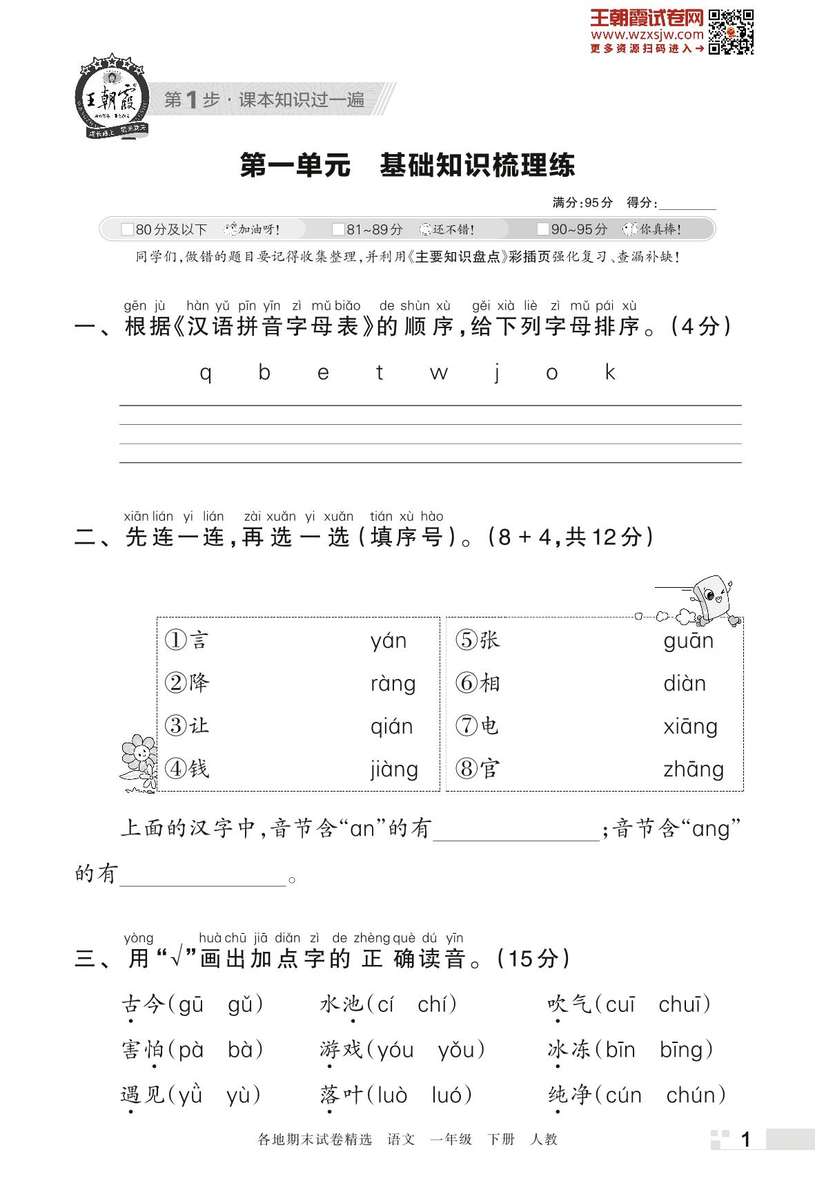 王朝霞期末过课本——第一单元 基础知识梳理练一年级下册语文(人教版)_R230419145037408