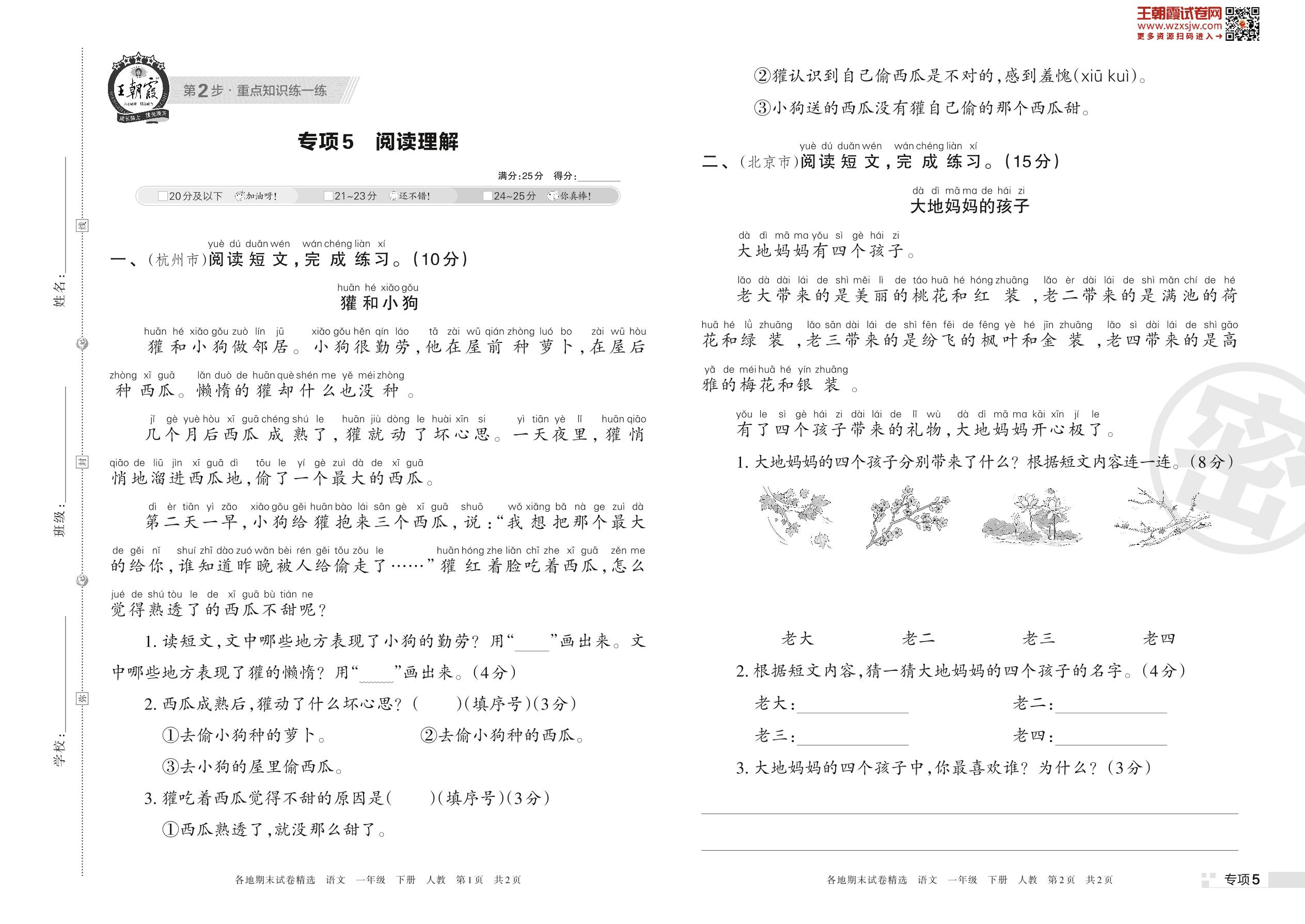 王朝霞期末专项卷——阅读理解一年级下册语文(人教版)_R230419145037967【5】